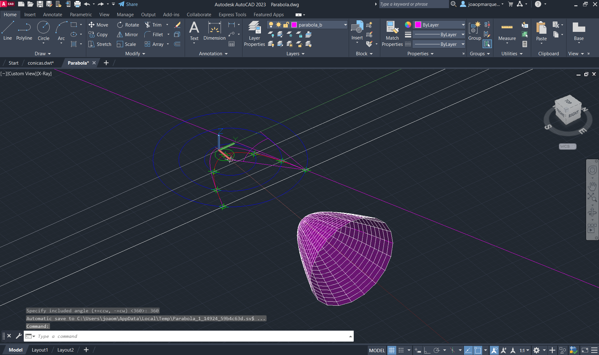 Construção de um paraboloide a partir da segunda parábola com o auxílio dos comandos: -VPOINT, TRIM, SURFTAB1, SURFTAB2, e REVSCULP.