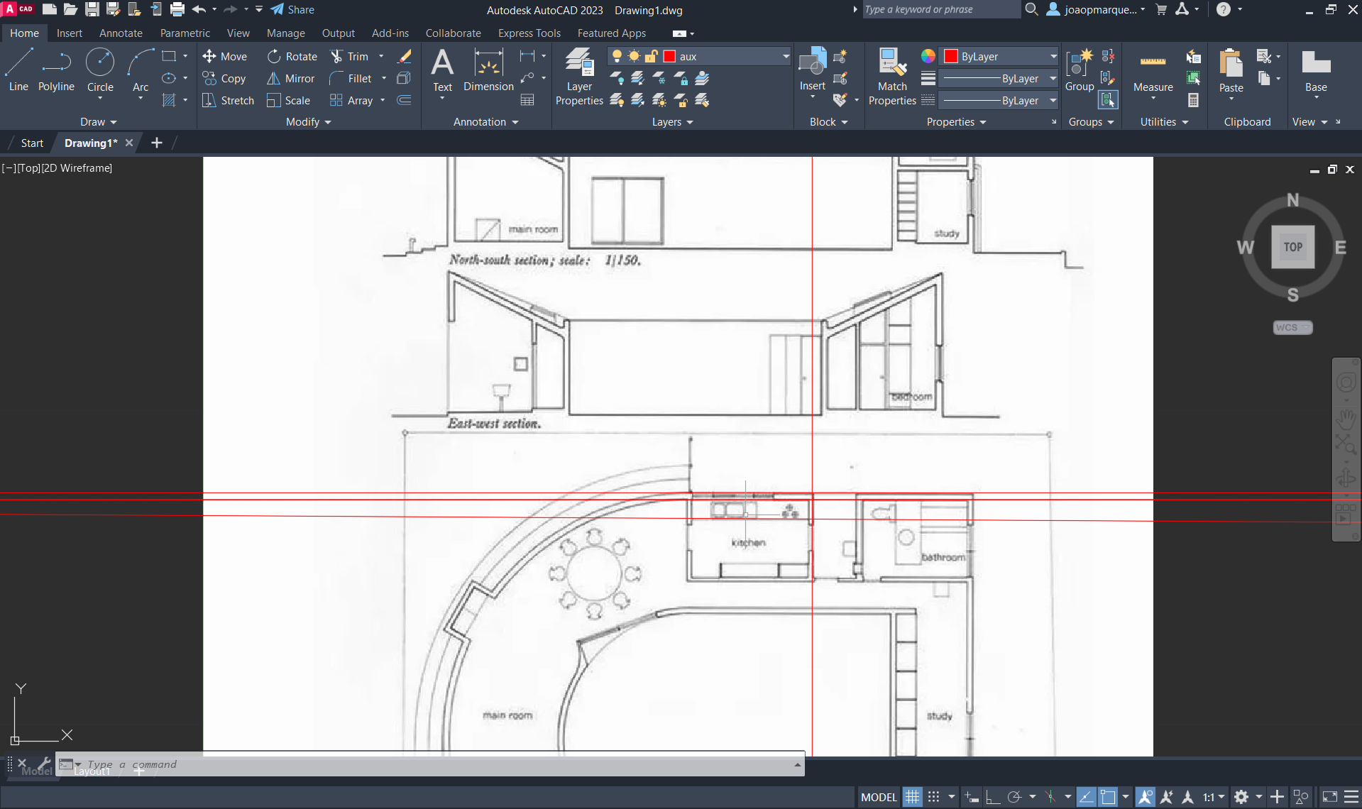 Delimitação da forma da casa através de retas, com o auxílio dos comandos: COPY, XLINE, OFFSET, CIRCLE e PLINE.