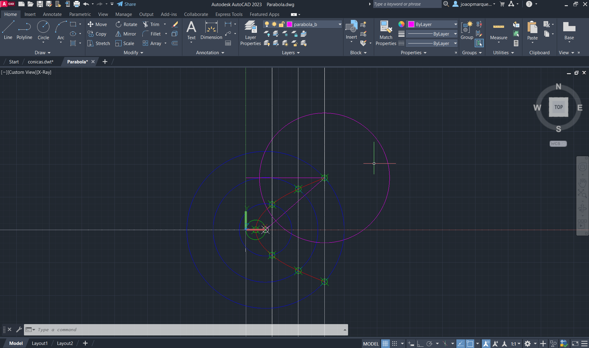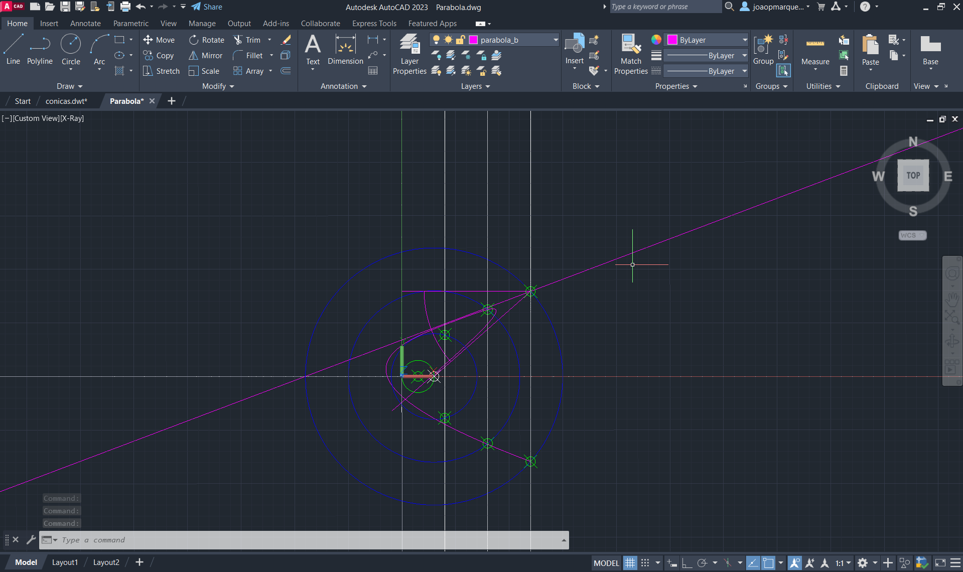Criação da segunda parábola, mais rigorosa, através dos comandos: LINE, CIRCLE, TRIM, XLINE, SPLINE e COPY.