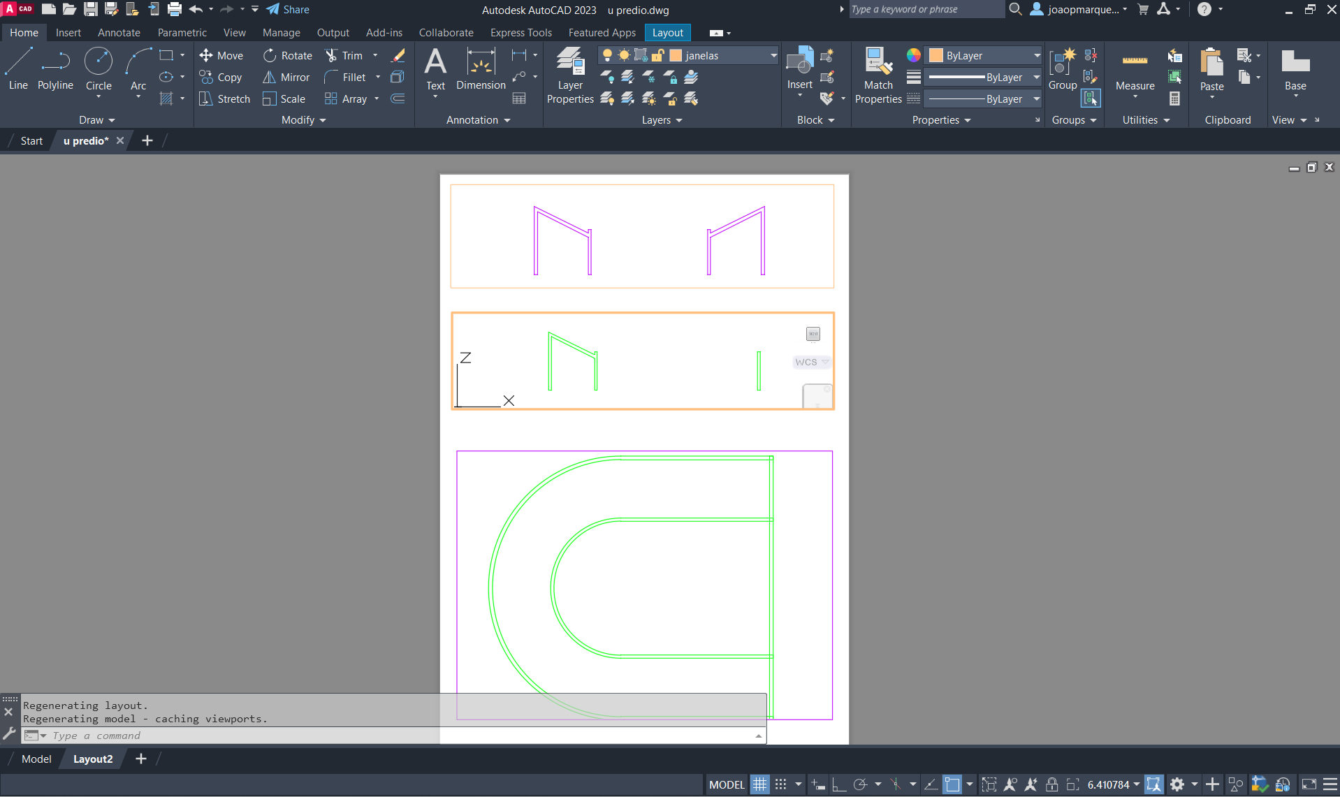 Criação de um layout numa folha A4 com a planta, um corte vertical e um corte longitudinal da casa, através dos comandos: MVIEW, ZOOM e UCS.