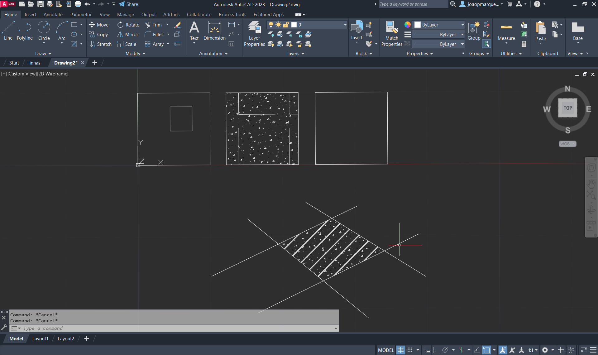 Criação de um retângulo no primeiro, e colocação de um preenchimento no segundo, através dos comandos: RECTANGLE e HATCH.