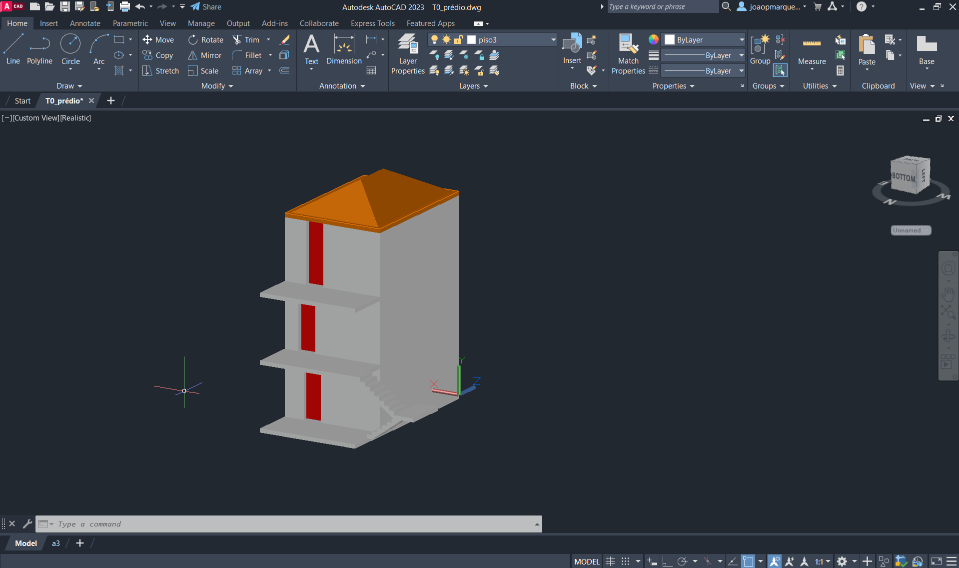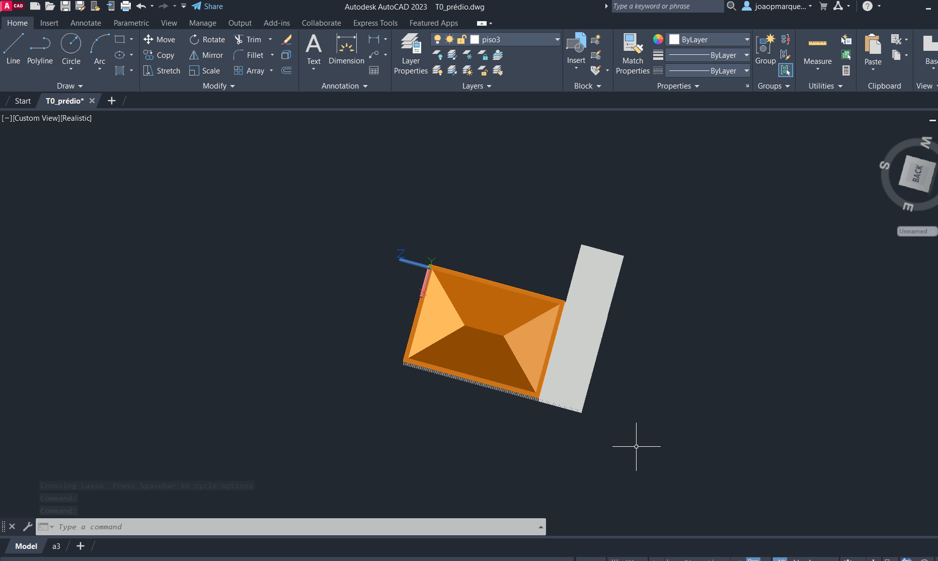 Colocação de uma cobertura inclinada no prédio, com ajuda dos comandos: RECTANGLE, EXTRUDE e OFFSET.