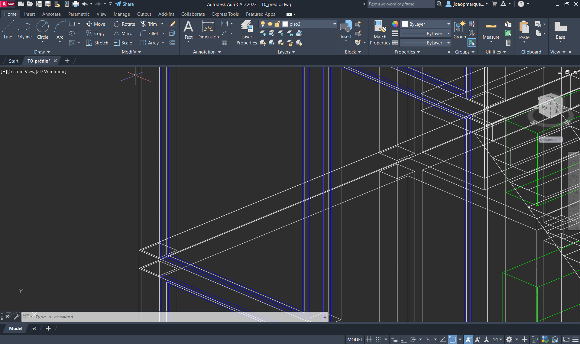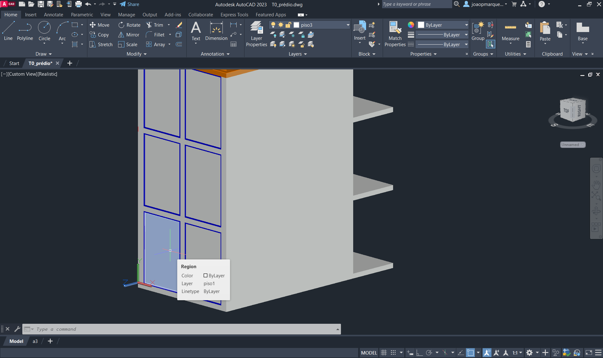 Criação de um novo ficheiro AutoCAD, para a execução de um prédio de três pisos (cada um numa layer diferente), através do comando anteriormente descarregado e utilizado: T0.
