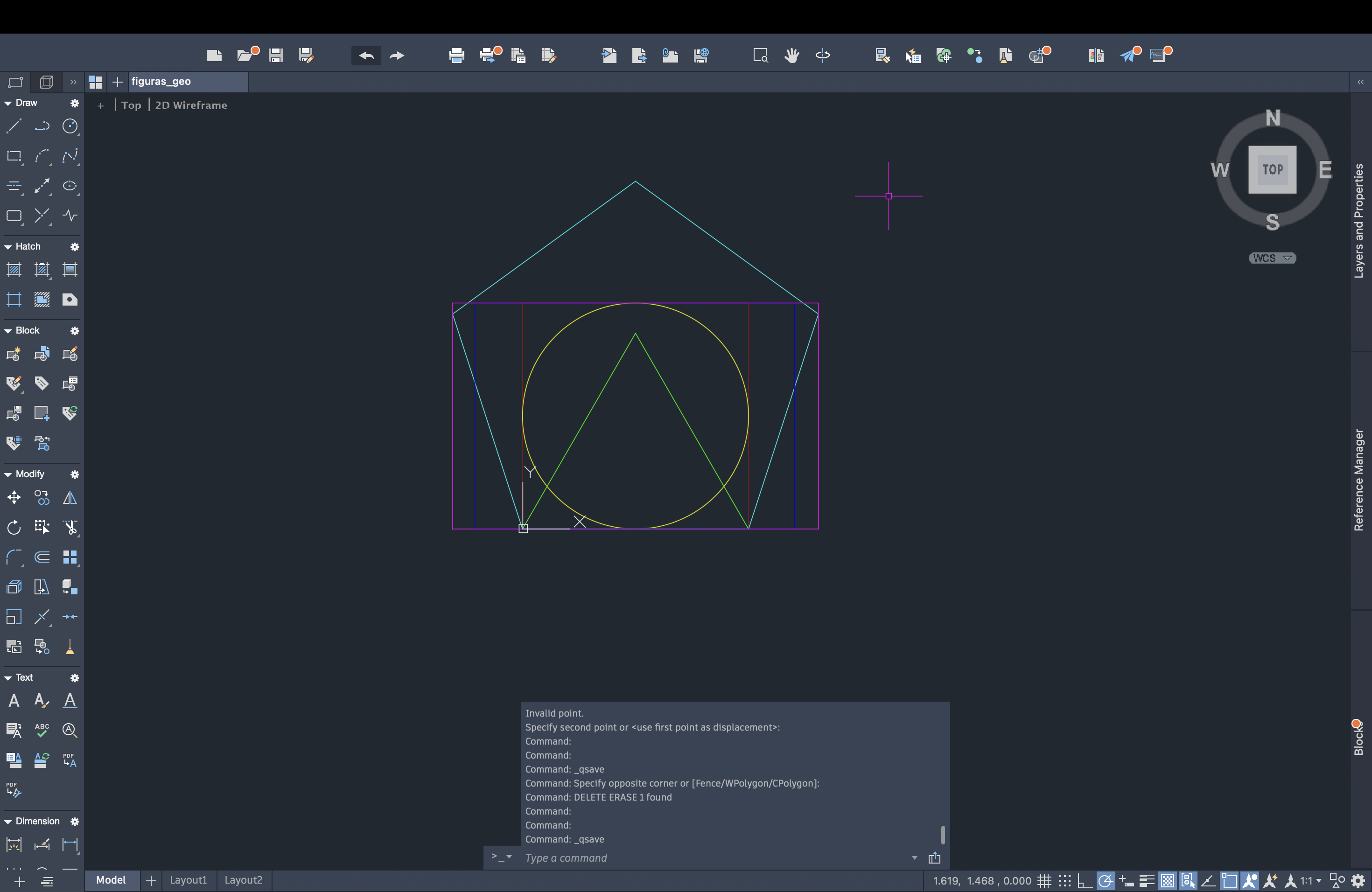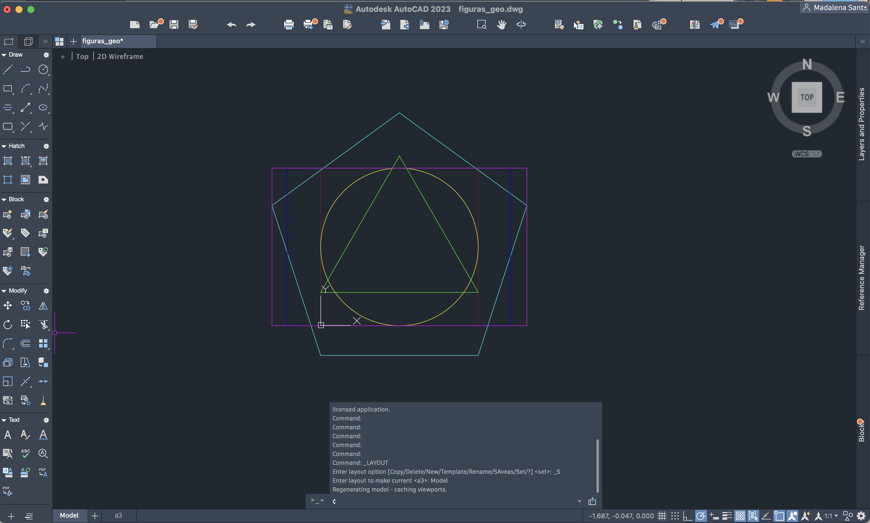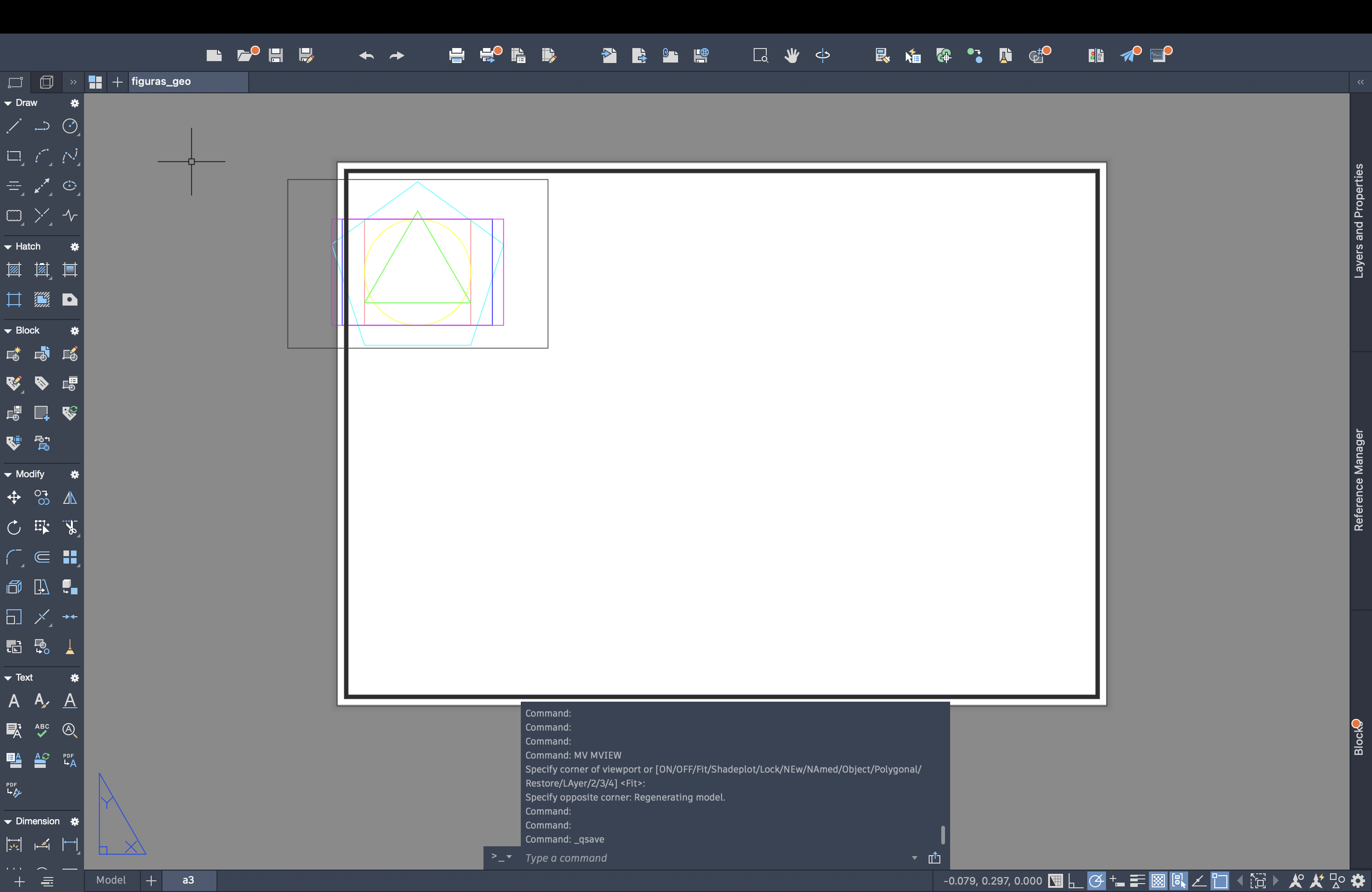 Continuação do trabalho das figuras geométricas no Autocad. Foram aplicados comandos para a construção de diferentes formas (quadrado, círculo, triângulo, pentágono e dois retângulos) e explorados recursos como line, polygon, circle, offset, trim, fillet, pedit, osnap, move e mview. Criação de um novo layer "a3", formação da folha A3 e execução de esquadria.