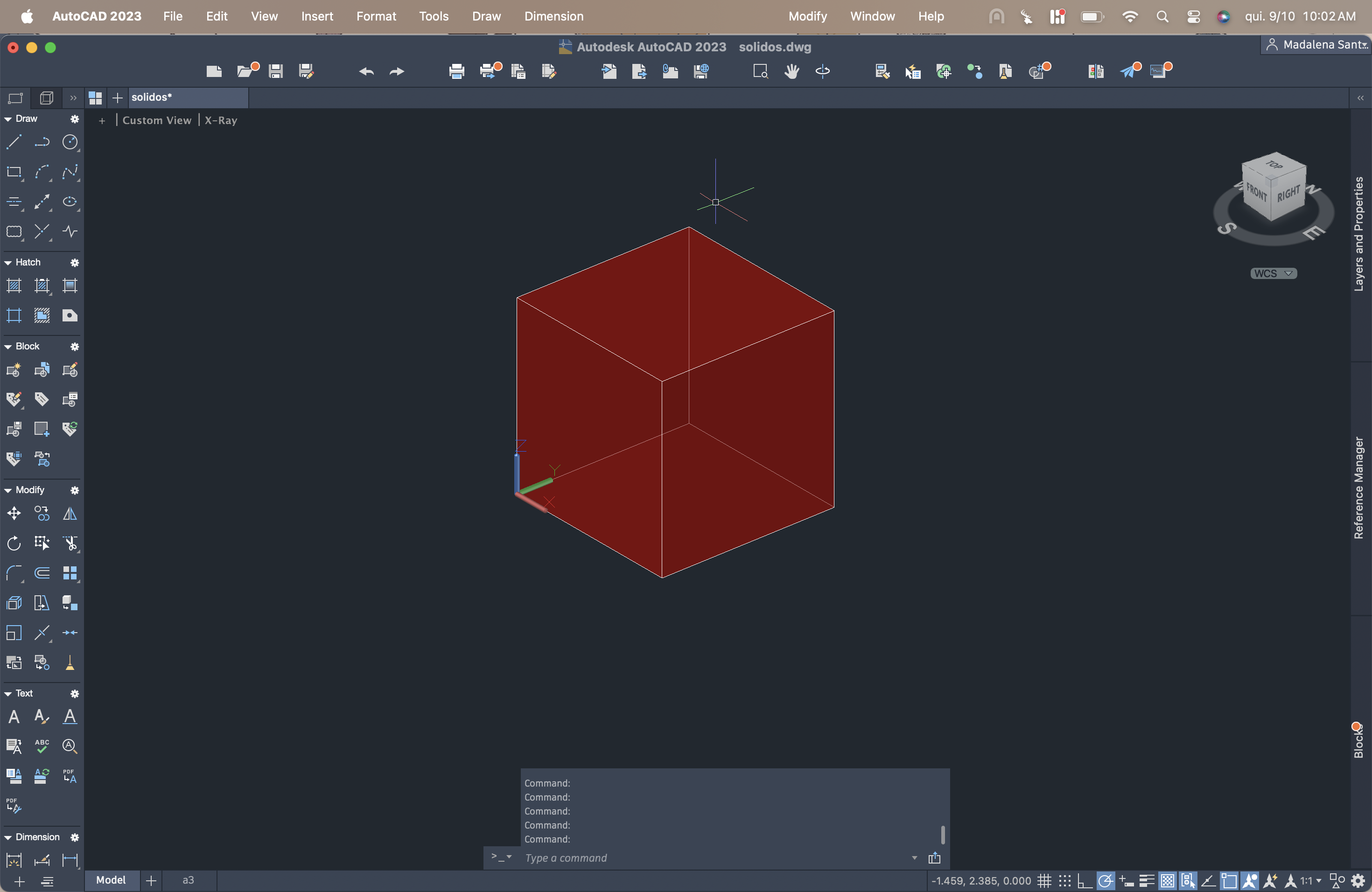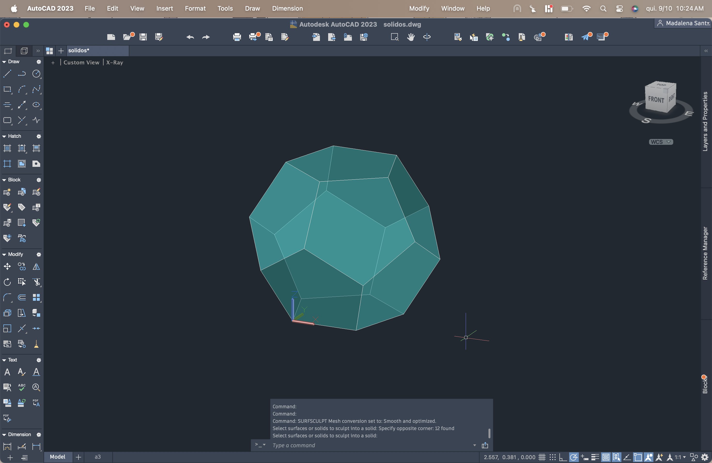 O cubo foi o primeiro sólido criado, aplicando os comandos REC e REGION para formar as faces, seguidos de COPY, UCS e ROTATE para ajustar a orientação e posicionamento no espaço 3D. O SURFSCULPT foi usado para unir superfícies e dar volume à figura.