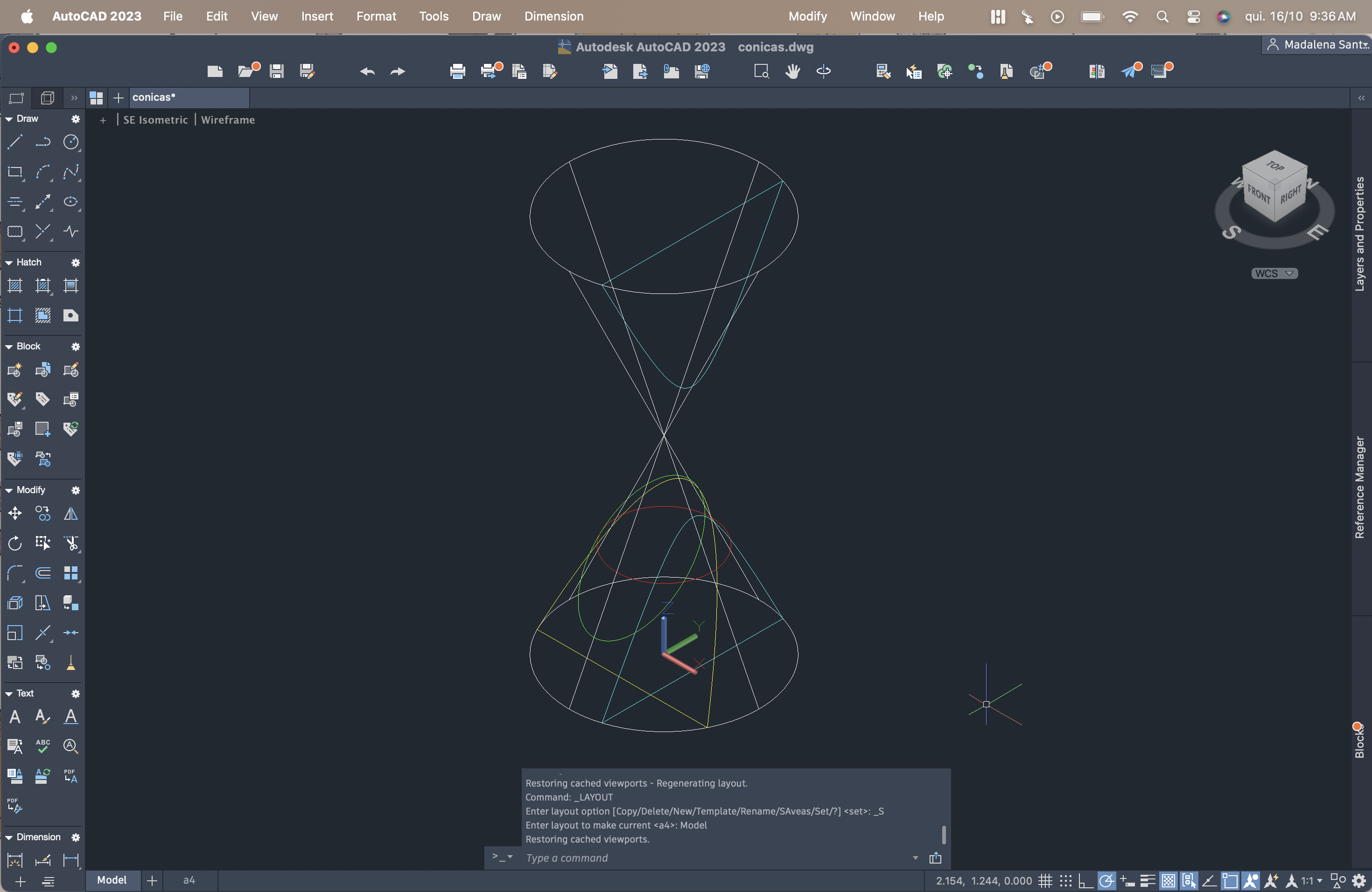 Prosseguimos com a construção de dois cones com recurso aos comandos CONE, alternando vistas com VPOINT e variando entre os estilos visuais 2D Wireframe e Shaded with Edges. O comando SECTION foi usado para cortar os cones e obter diferentes curvas.