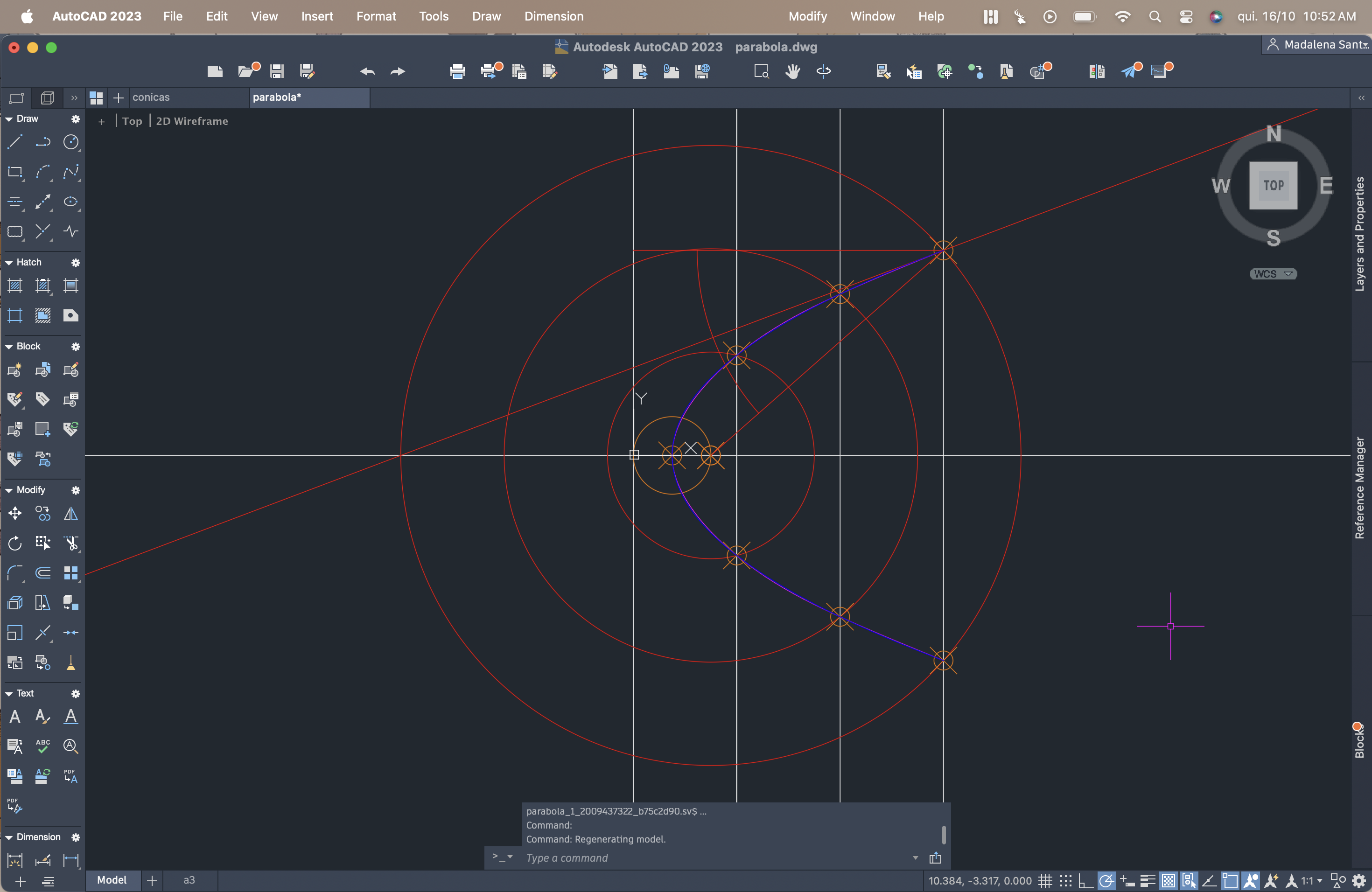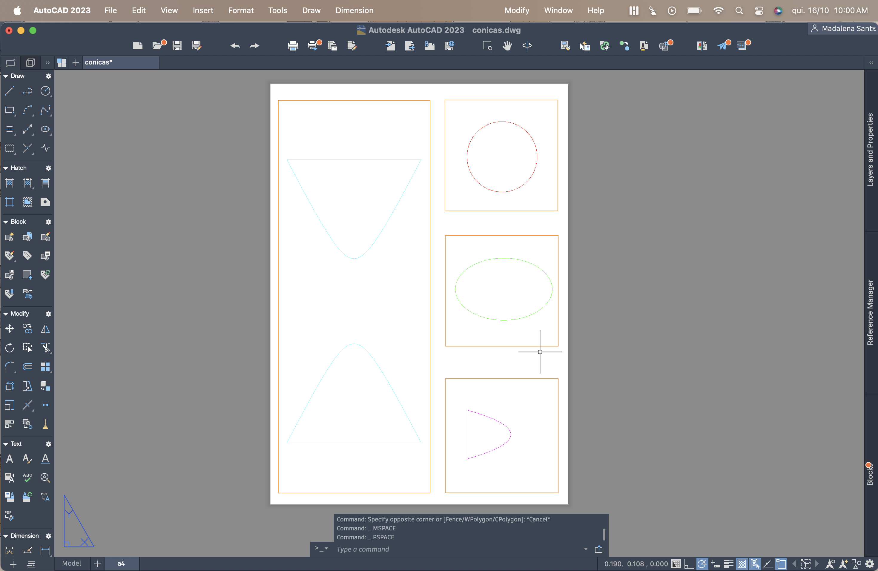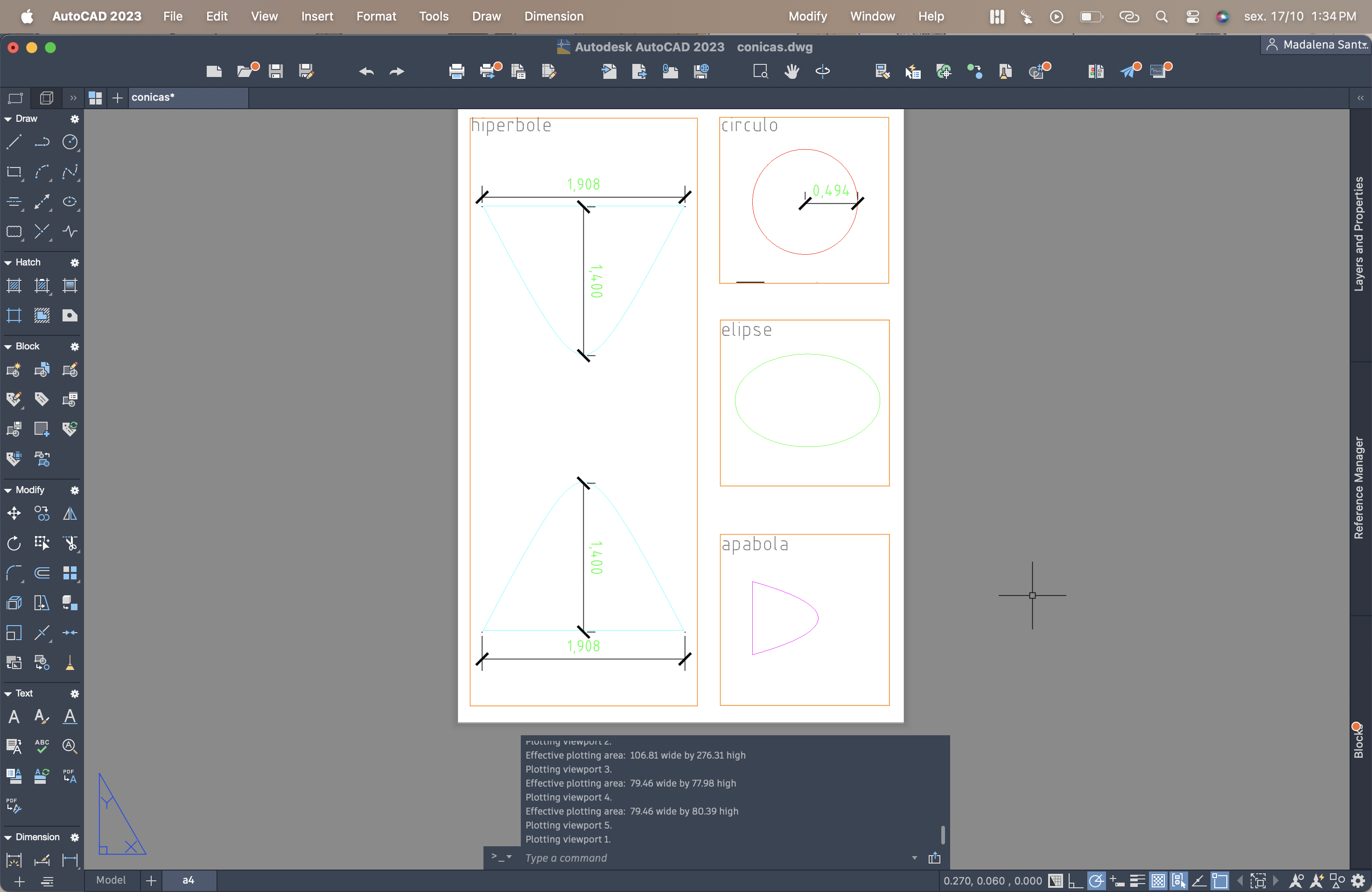 Criação de um novo ficheiro. Inicio do estudo das secções cónicas, criando cinco novas LAYERS: conicas, parabola, elipse, circulo e hiperbola.