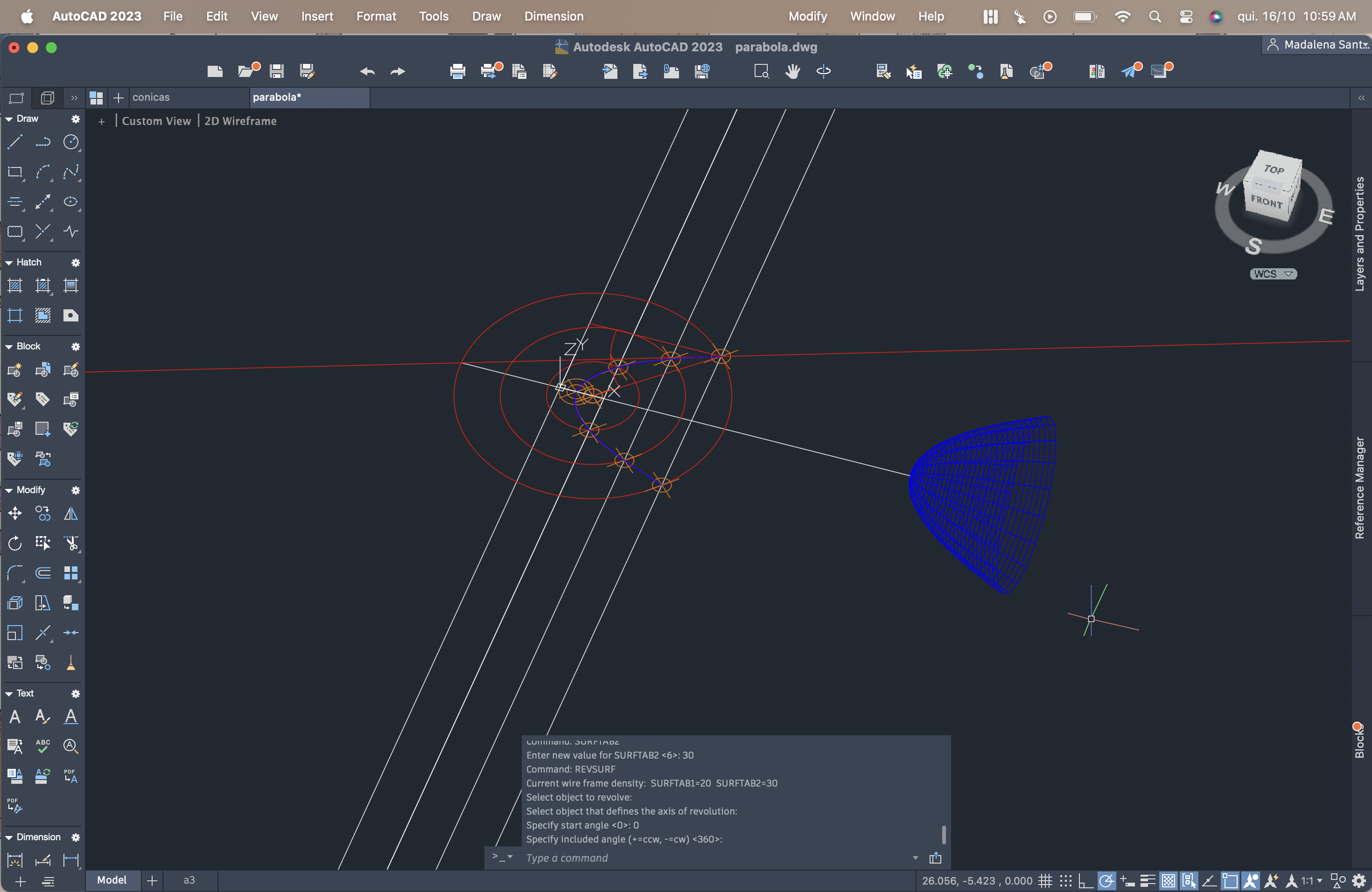 Ainda foi criado um outro novo ficheiro dedicado à parábola, foram criadas LAYERS (aux, eixo_dir_f, pontos, parabola_a, parabola_b) e foram explorados os comandos POINT, DDPTYPE, OFFSET, CIRCLE, SPLINE, TRIM e SURFTAB1/2 para definir as curvas. Terminando com o comando REVSURF, criando uma superfície de revolução da parábola em torno do eixo principal, concluindo assim a esploraçãodas cónicas em 3D.