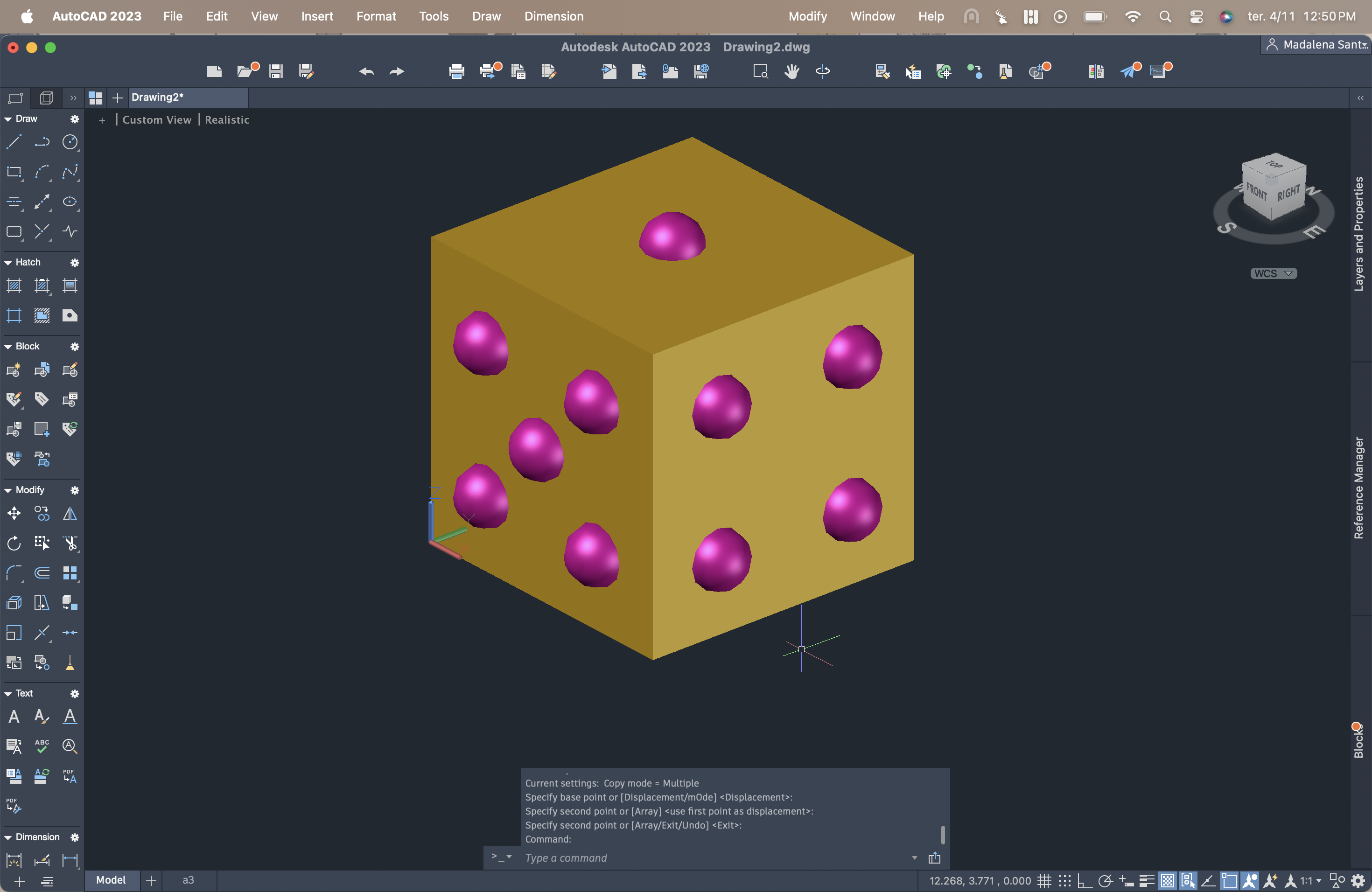Foram criadas as layers "dado", "pintas" e "aux", e utilizados os comandos BOX, XLINE, OFFSET e FILLET para gerar o cubo e definir as respetivas arestas. Com o comando SPHERE, foram criadas as esferas representativas dos pontos do dado, posteriormente posicionadas e replicadas com COPY, ALIGN e ARRAYCLASSIC. Os sólidos foram combinados e ajustados com os comandos UNION e SUBTRACT, completando assim o volume final do dado.