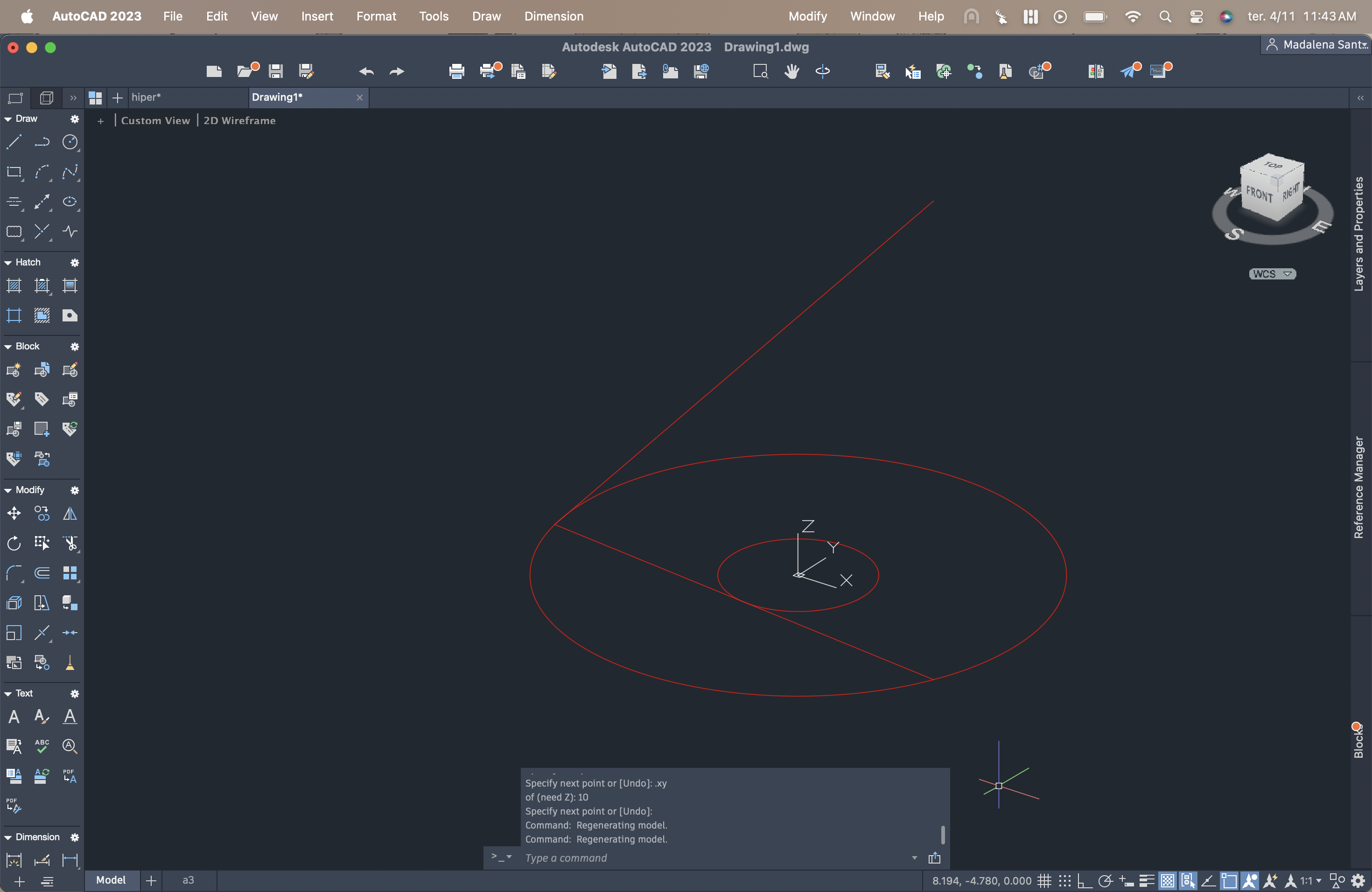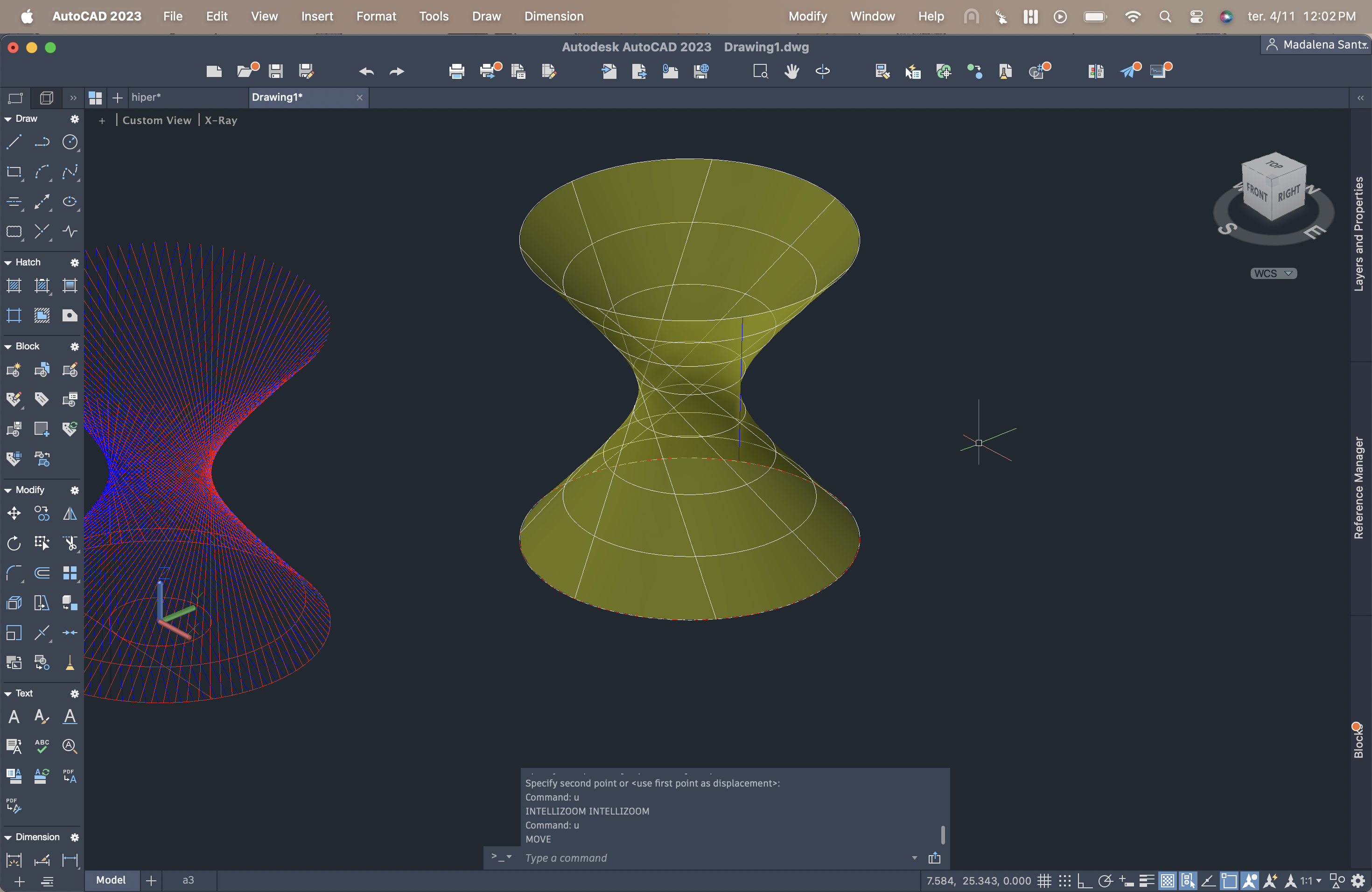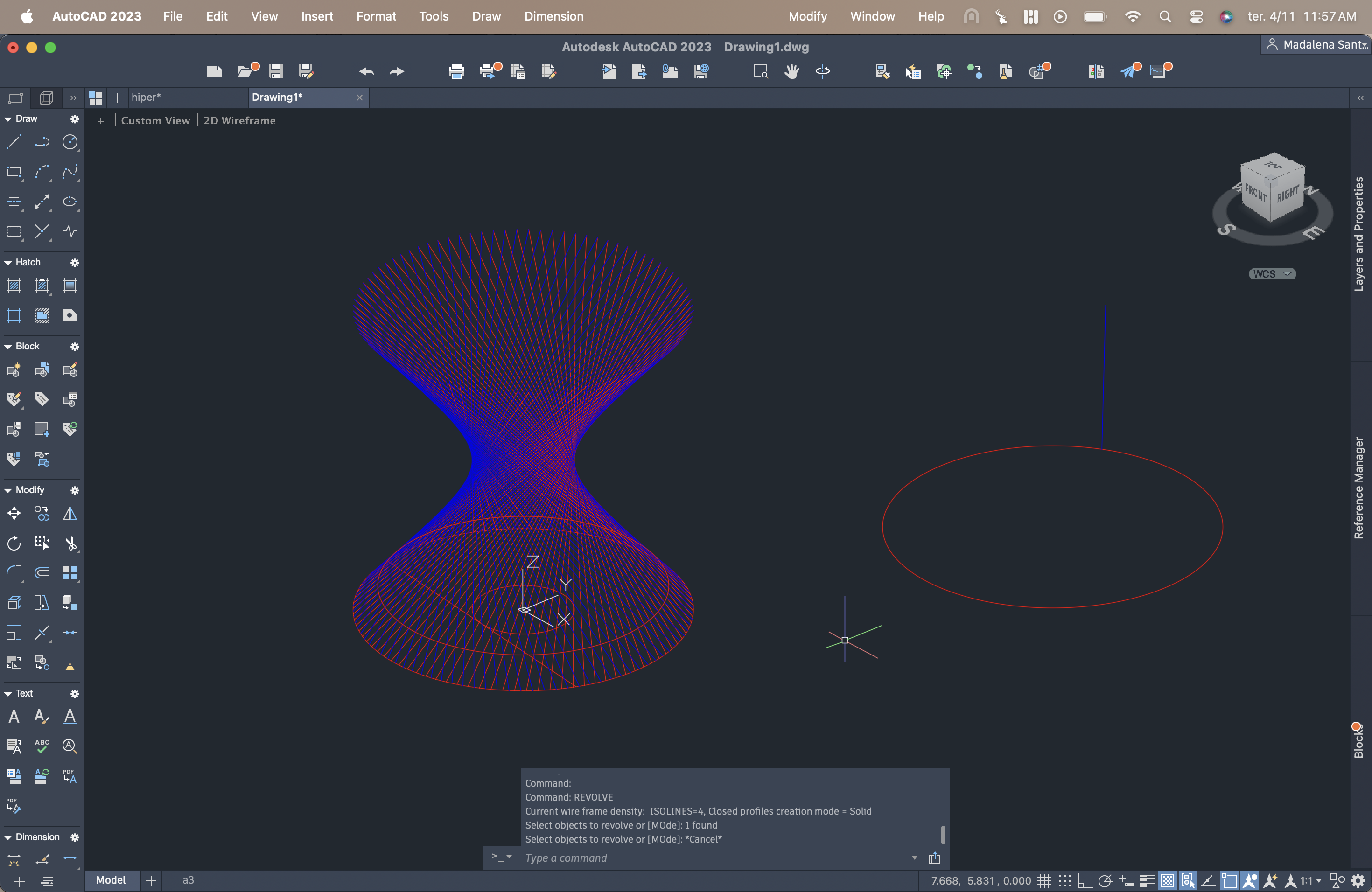 Continuação e finalização do trabalho iniciado na aula anterior. O exercício das hiperboloides foi concluido, utilizando os comandos EXTEND, LINE, MIRROR, COPY, PROPERTIES e ARRAYCLASSIC, de forma a completar e organizar as formas geométricas.