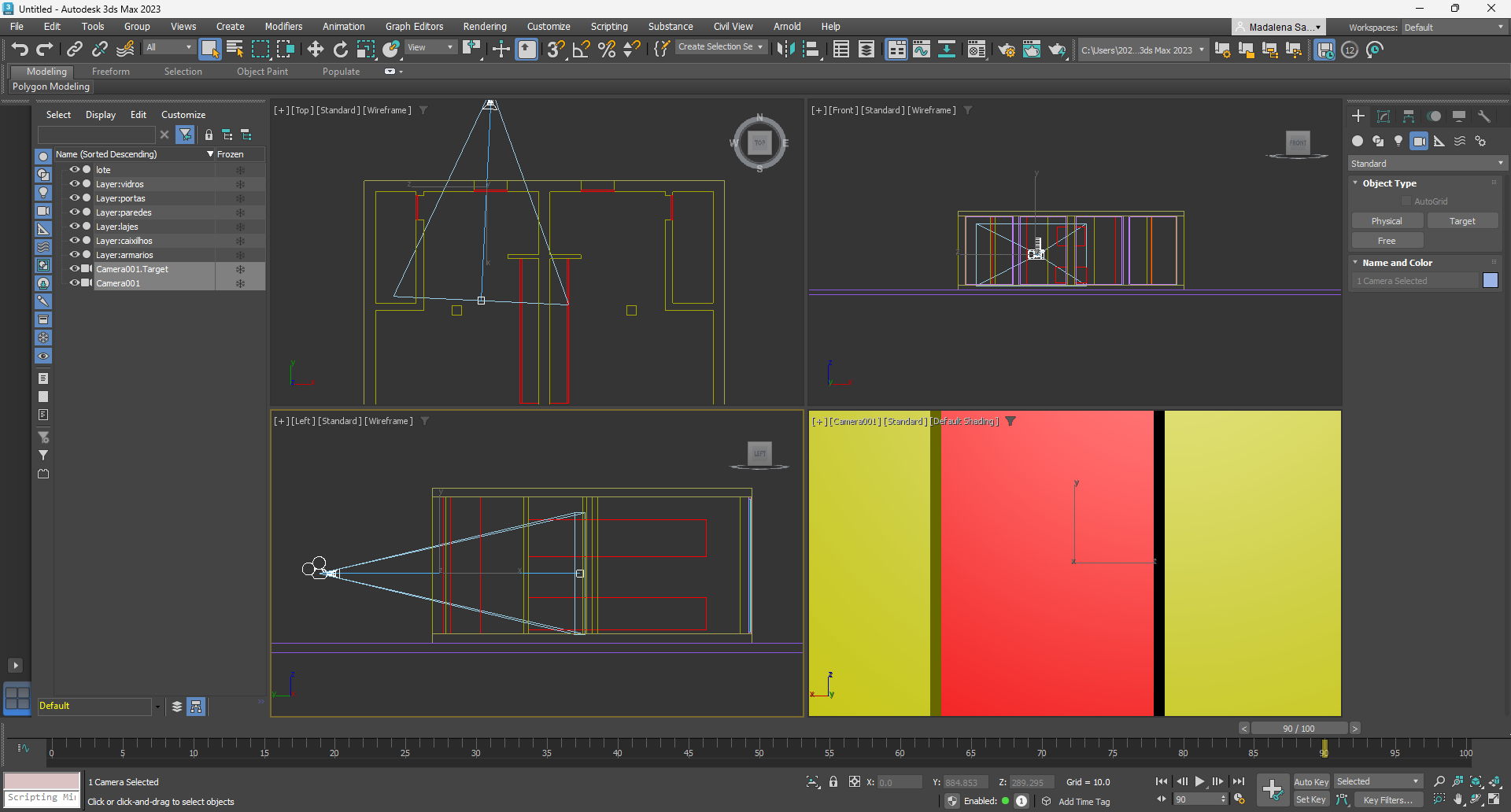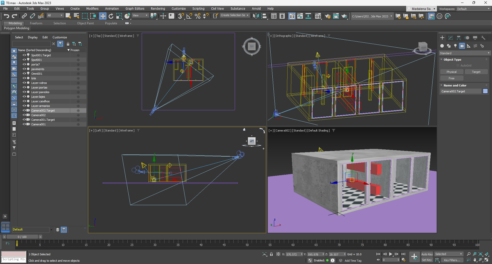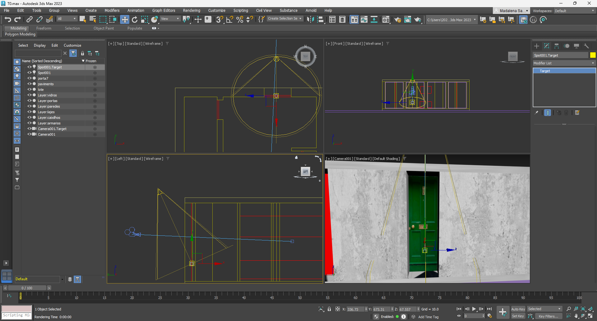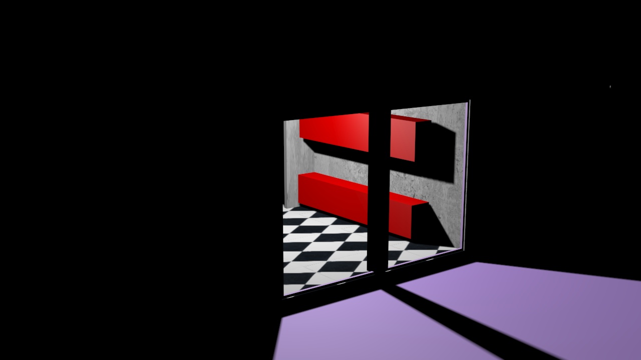 Introduziu-se uma luz para trabalhar a iluminação da cena, complementada pela criação de uma segunda luz e de uma câmara, permitindo observar e captar o efeito da luz refletido nas janelas.