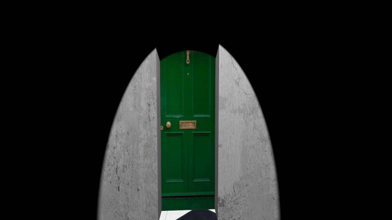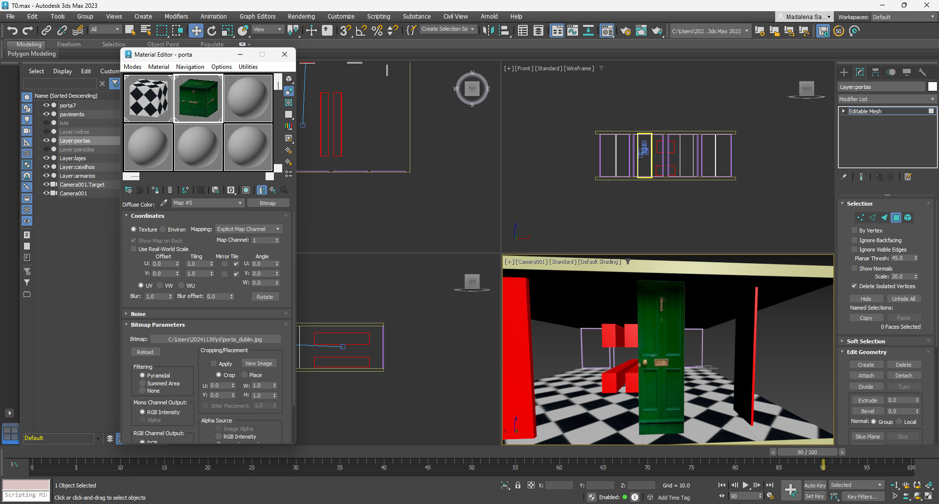 Seguindo o mesmo método utilizado no pavimento, foi incorporada uma porta "estilo Dublin" editada no GIMP. A imagem foi aplicada no 3DS MAX através das ferramentas POLYGON e MATERIAL EDITOR, sendo depois ajustada à geometria da porta com o auxílio do GIZMO.