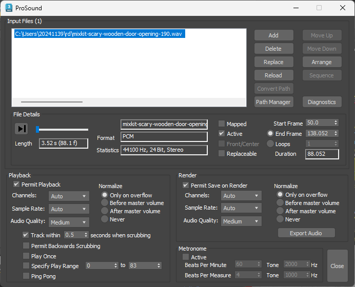 Ainda foi iniciado o estudo de uma animação, ajustando a diração e os intervalos de tempo através da ferramenta TIME CONFIGURATION. De seguida, foi introduzido um elemento sonoro, nomeadamente o som de uma porta a abrir, utilizando as ferramentas GRAPH SHEETS e DOPE SHEET para sincronizar o áudio com a animação.
