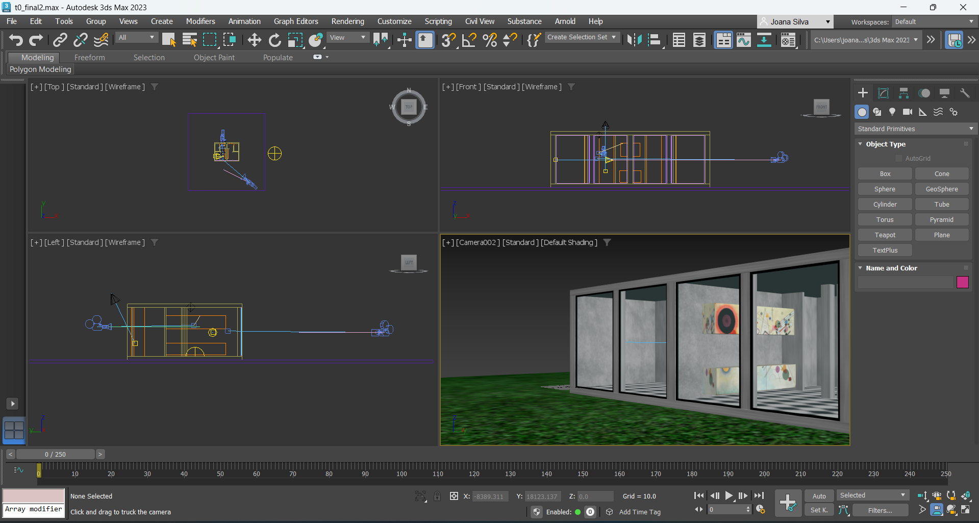Continuação da aula anterior. Desligamos as luzes criadas anteriormente e adicionamos uma luz natural (Standard, Skyline) do lado direito da Box. De seguida, movemos a camara2 de modo a ver a parede da sala para podermos projetar o quadro de Kandisky. Adicionamos uma luz Target Spot alterando as caracteríticas Rectangle e Projector Map, selecionando Bitmap e a imagem do quadro. De seguida, movemos novamente a camara e adicionamos uma linha para criar outro movimento com 1,46m de altura observando a casa de fora.