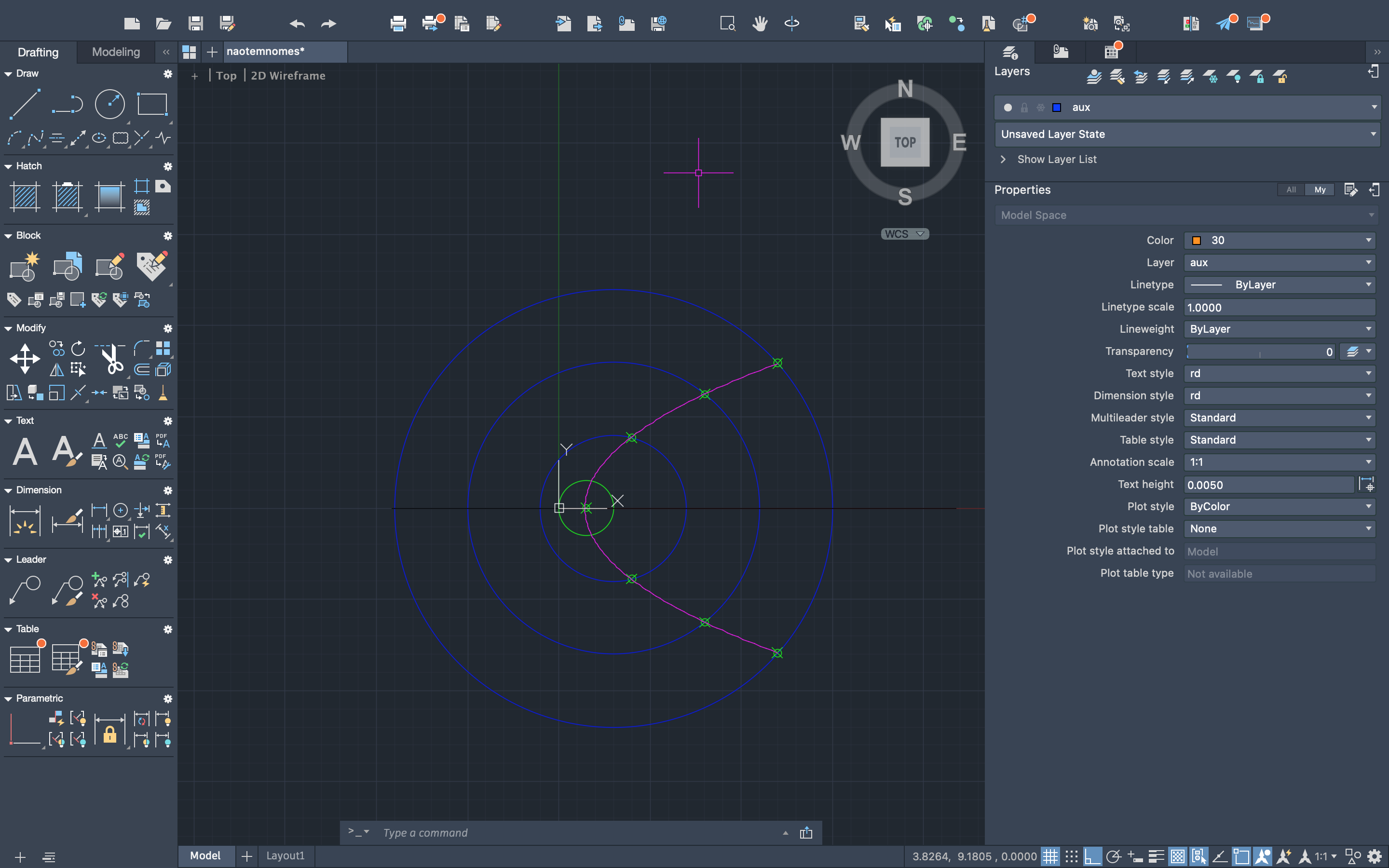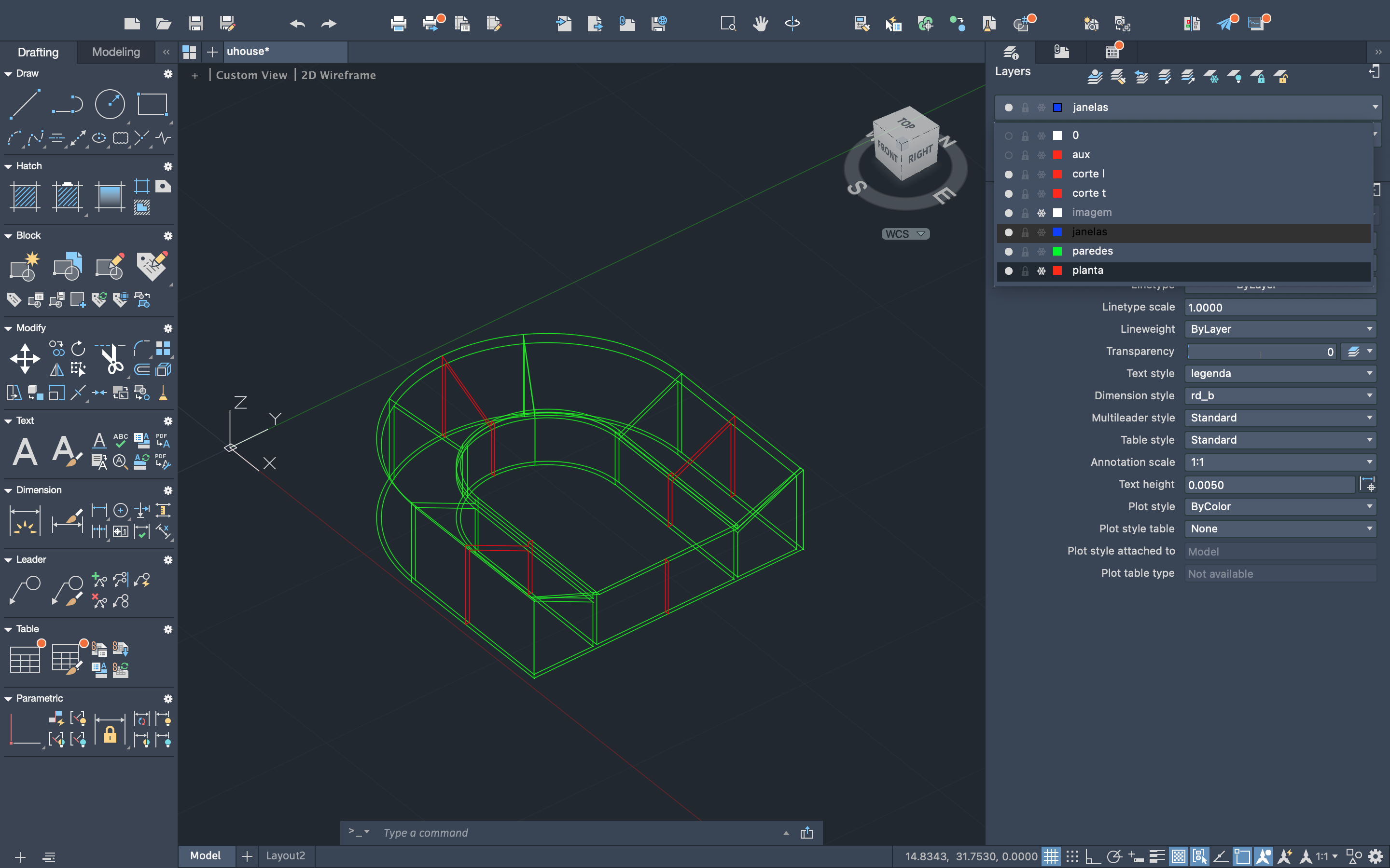 Delimitação da forma da casa através de retas, com o auxílio dos comandos "COPY", "XLINE", "OFFSET", "CIRCLE" e "PLINE".