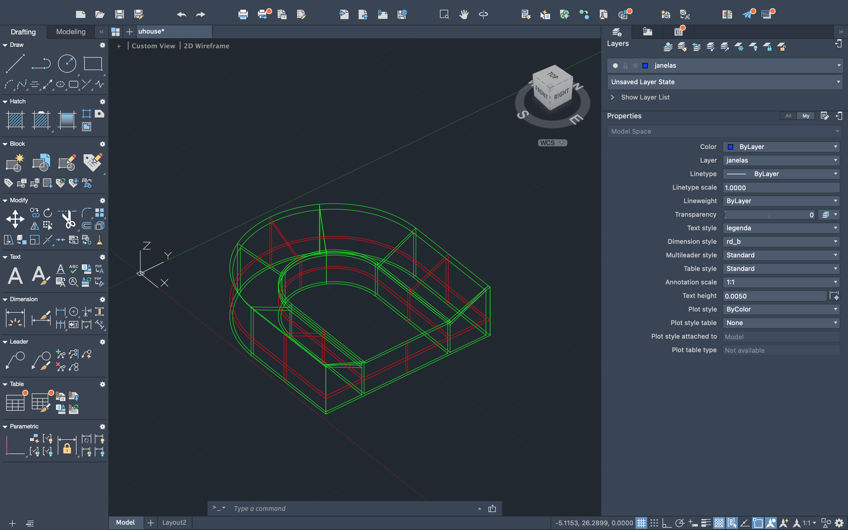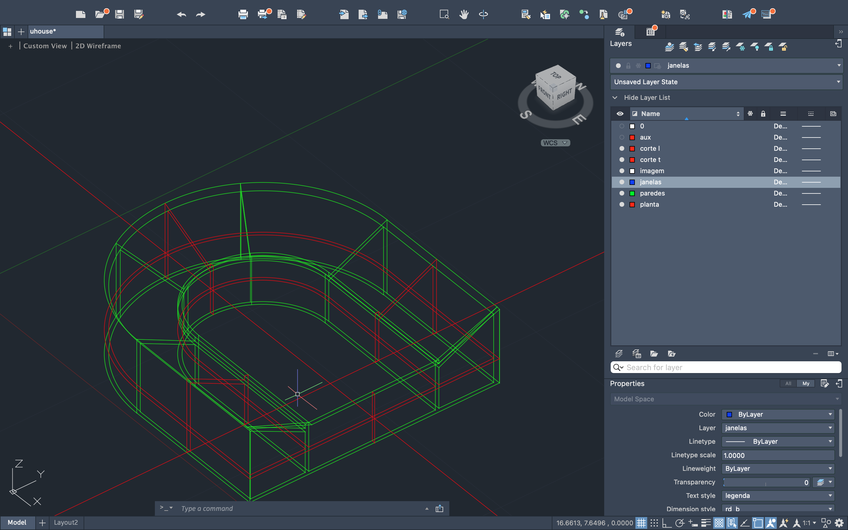 Através da forma da base e de um perfil, criação do formato da casa e fechamento, com a utilização dos comandos "MOVE", "ROTATE", "UCS" e "EXTRUDE".