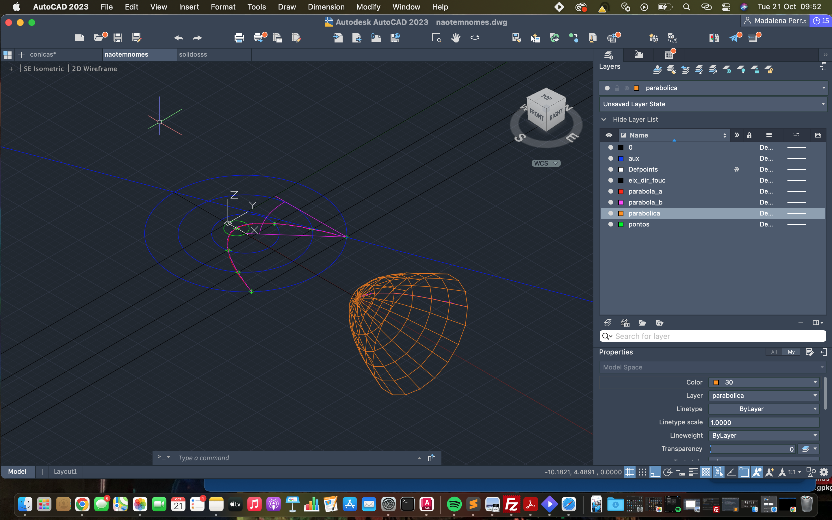Criação de uma segunda parábola, esta mais rigorosa, através dos comandos "LINE", "CIRCLE", "TRIM", "XLINE", "SPLINE" e "COPY".