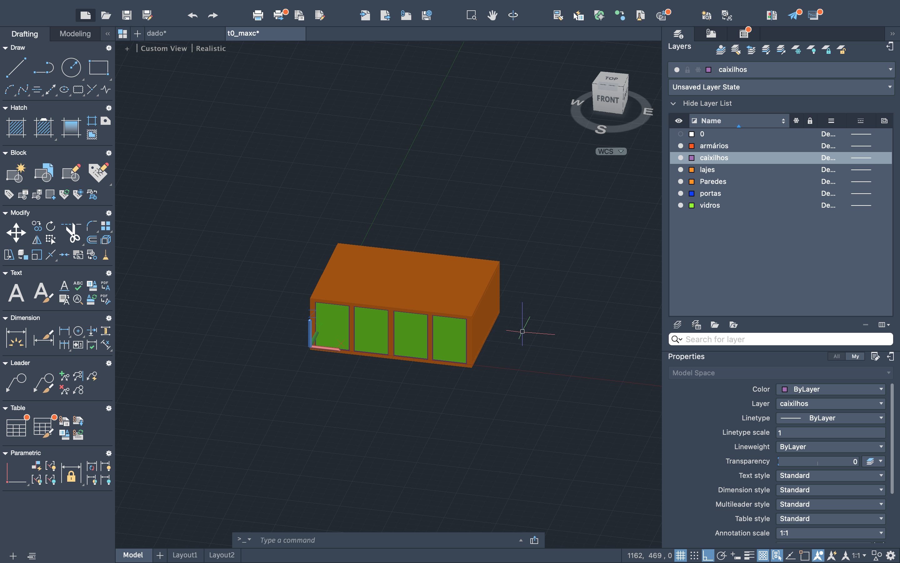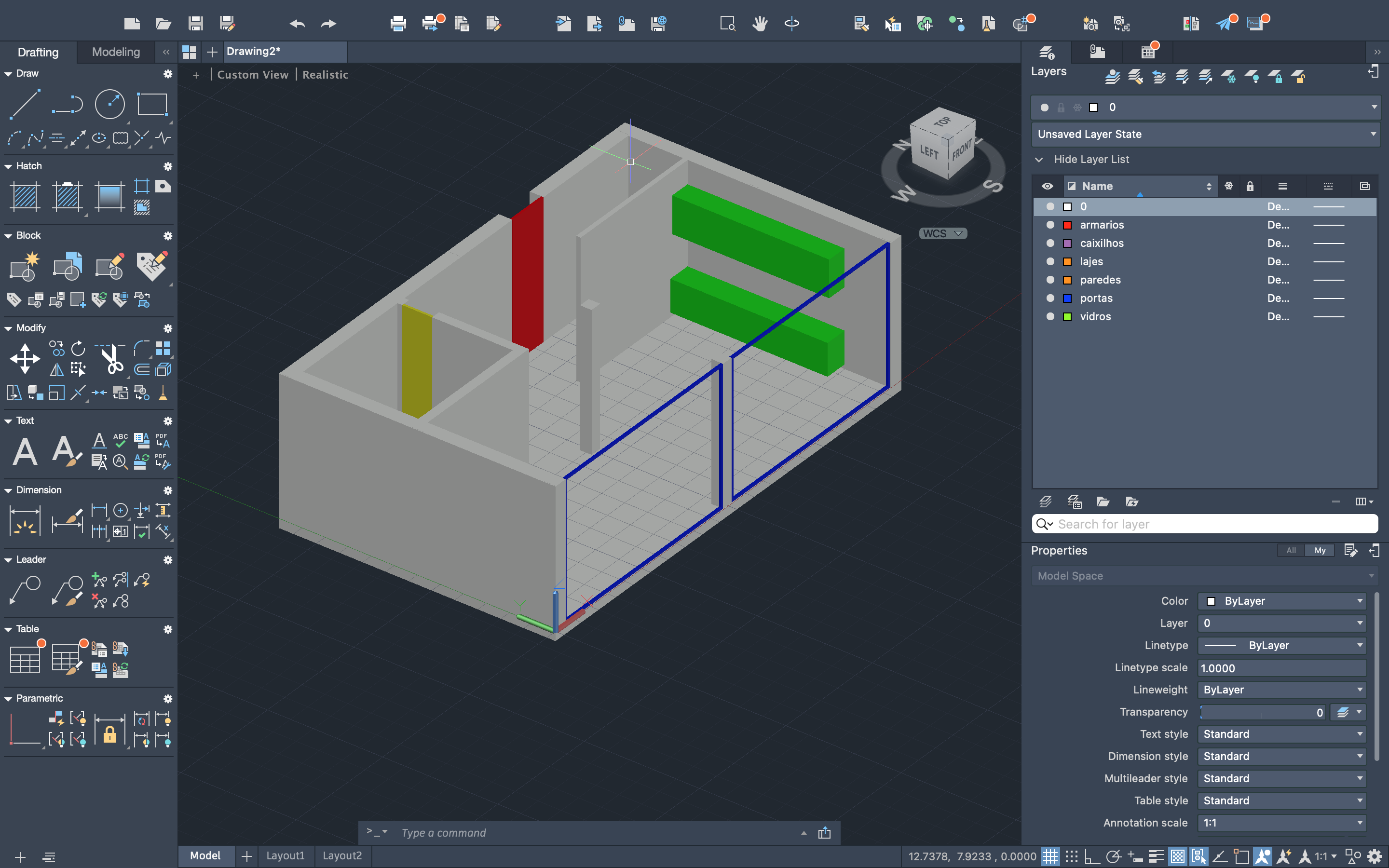Mudança dos elementos para as suas layers e cores correspondentes nas "PROPRIETIES". Depois, união das paredes e pilares, através do comando "UNION".