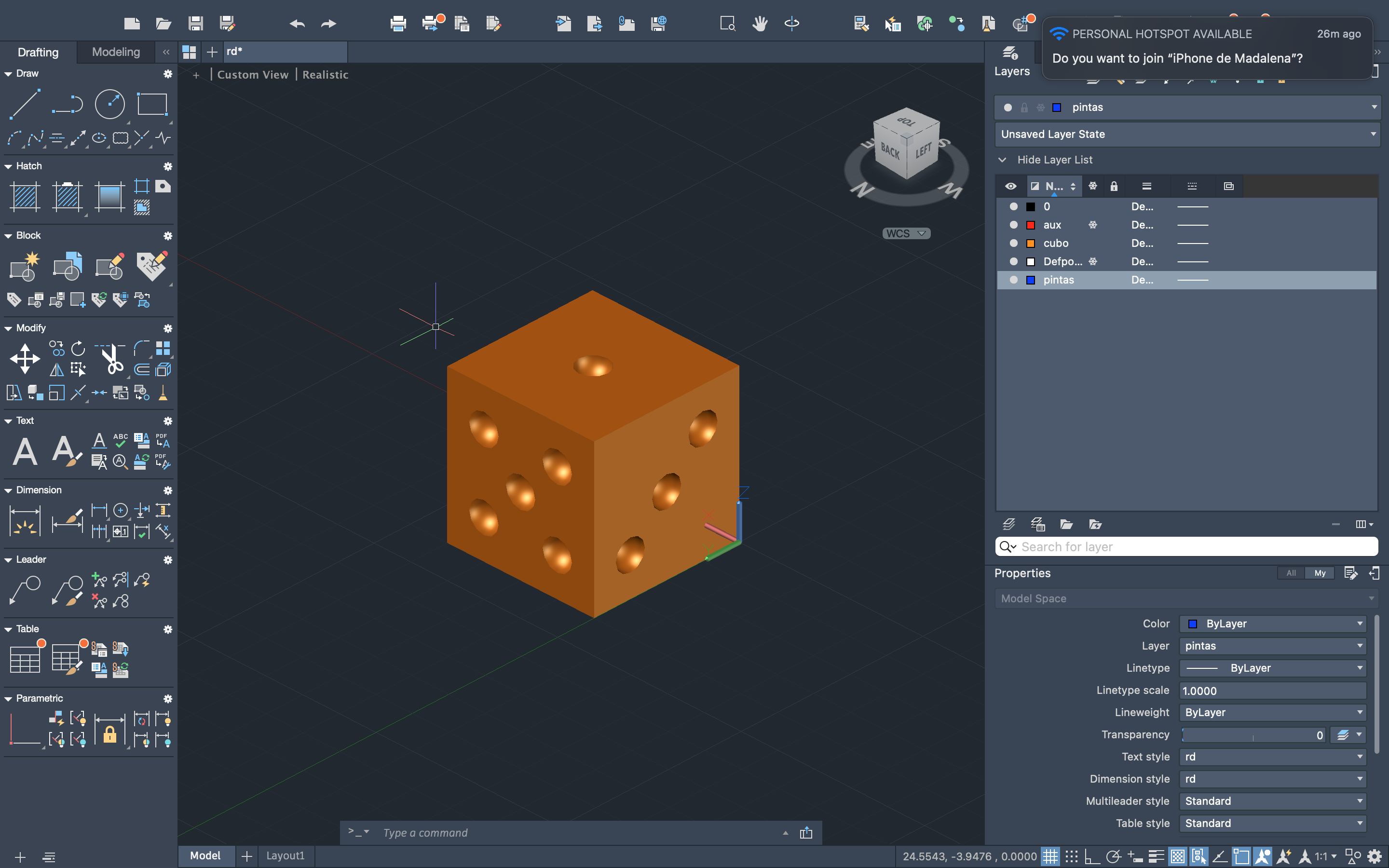 Criação da layer "pintas". Colocação de esferas, com 1 de diâmetro, na grelha da base, de forma a fazer o lado do dado que contém seis pintas. Depois fazer a cópia e colocação das restantes esferas nas outras faces do cubo, segundo a planificação de um dado, através dos comandos "SPHERE", "COPY" e "ALIGN".
