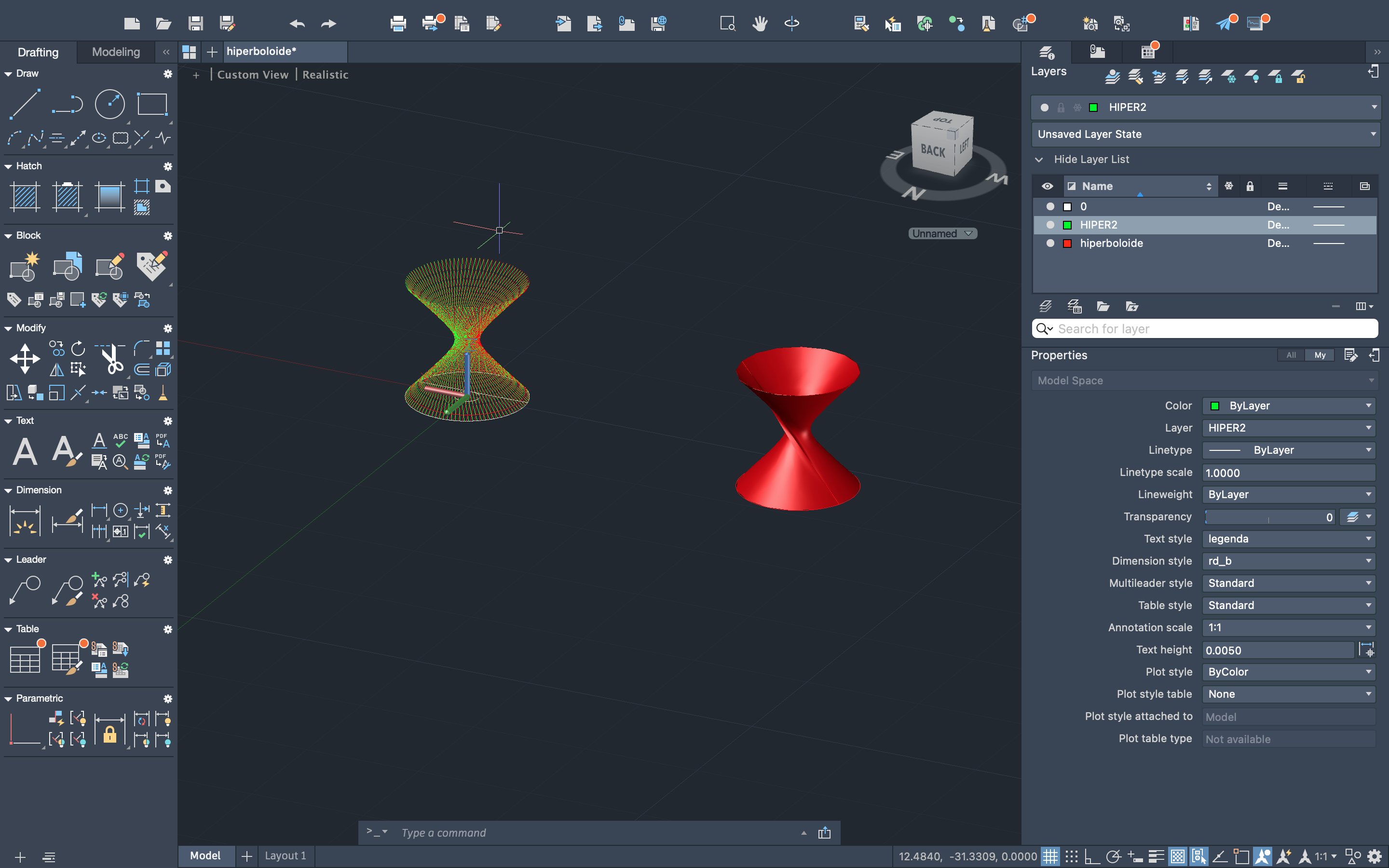 Execução da uma cópia da hiperboloide ao lado da mesma, utilizando o comando "COPY", seguido dos comandos "REVOLVE" e "THICKEN", onde se criou uma espessura de 1 no objeto.