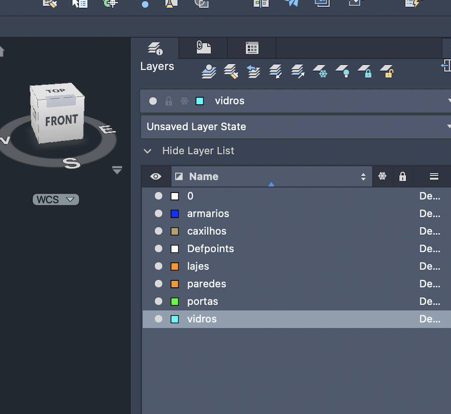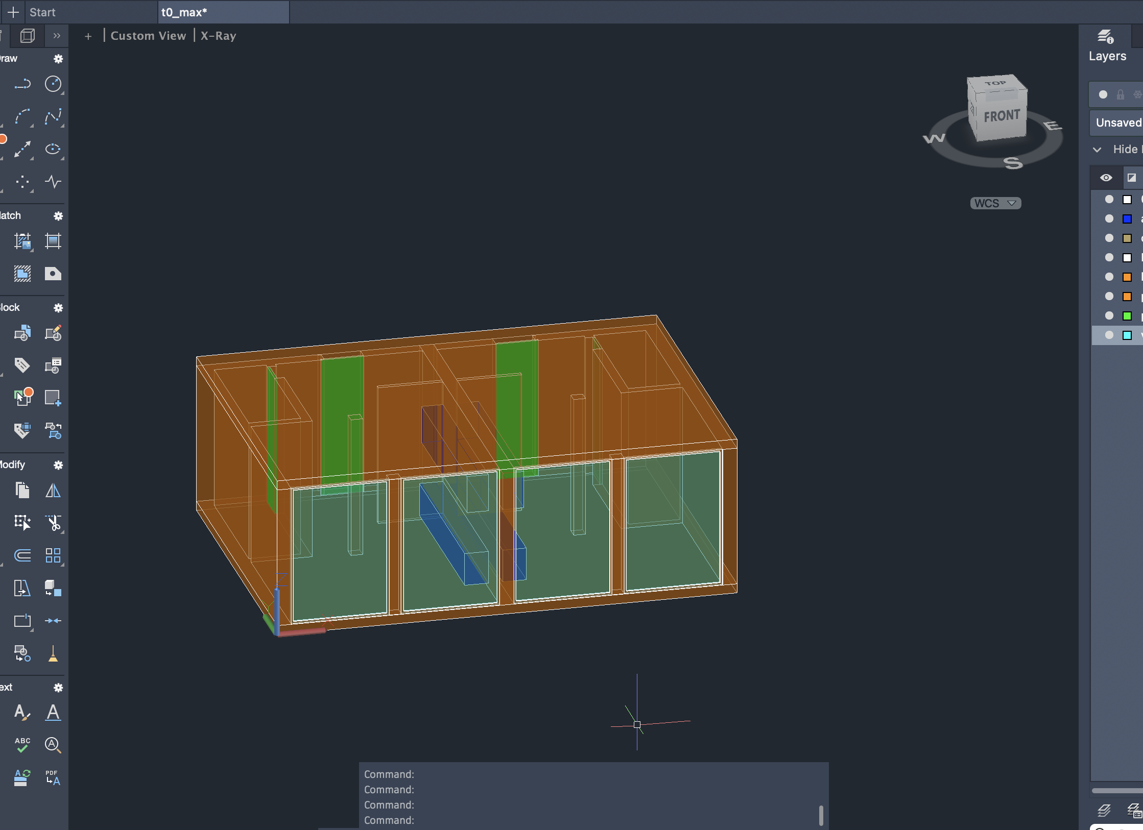 Primeiramente abrimos o ficheiro t0.lsp no Autocad (T0), duplicamos com o comando MIRROR para que os dois apartamentos fiquem juntos. Unimos as paredes, o pavimento e a cobertura. Dimensionamos tudo para que as unidades fiquem em centímetros. Por fim, classificámos os diferentes objetos de acordo com a sua tipologia.