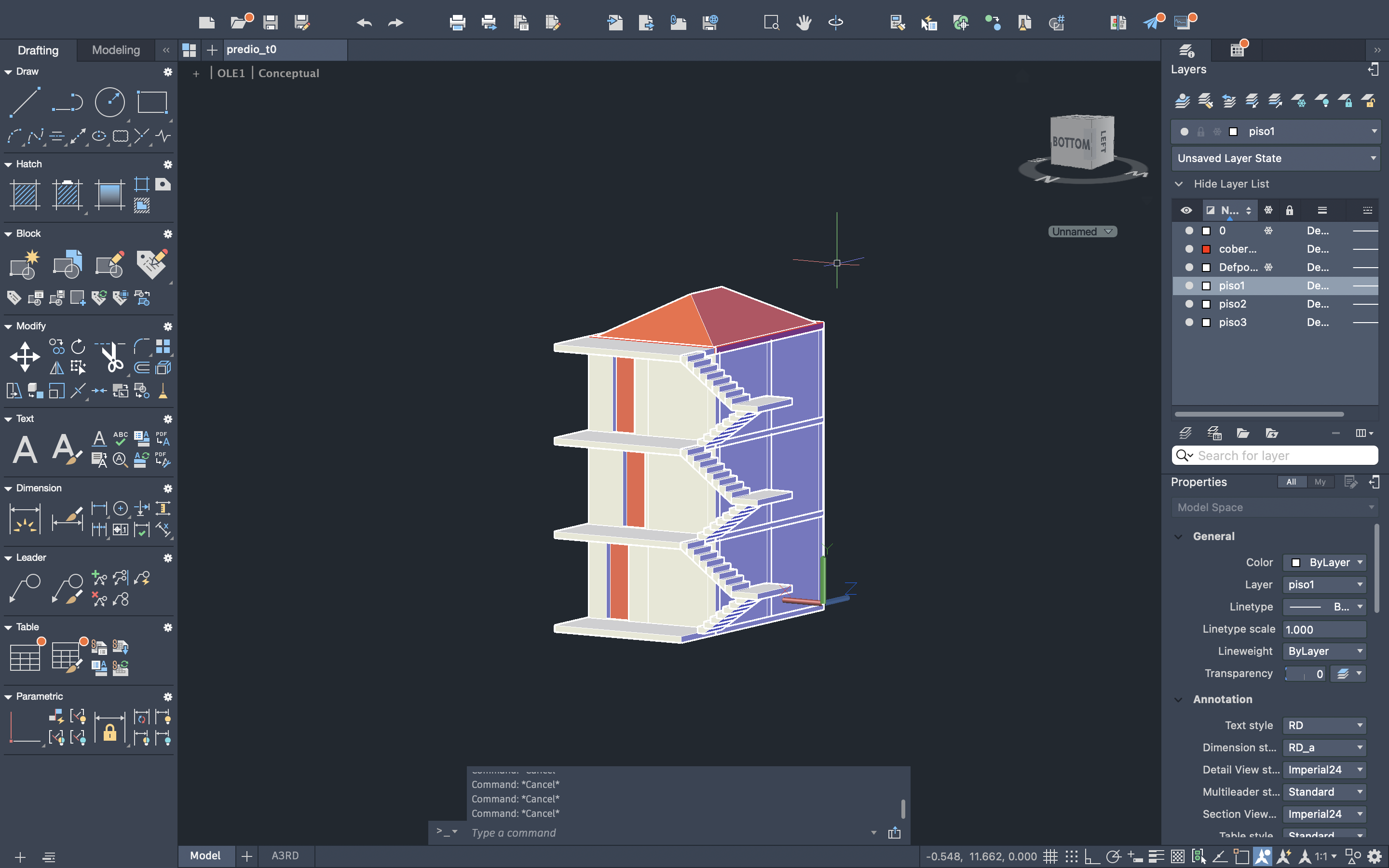 Criação de um prédio de três pisos (cada um numa layer diferente), através do comando anteriormente descarregado e utilizado: T0.