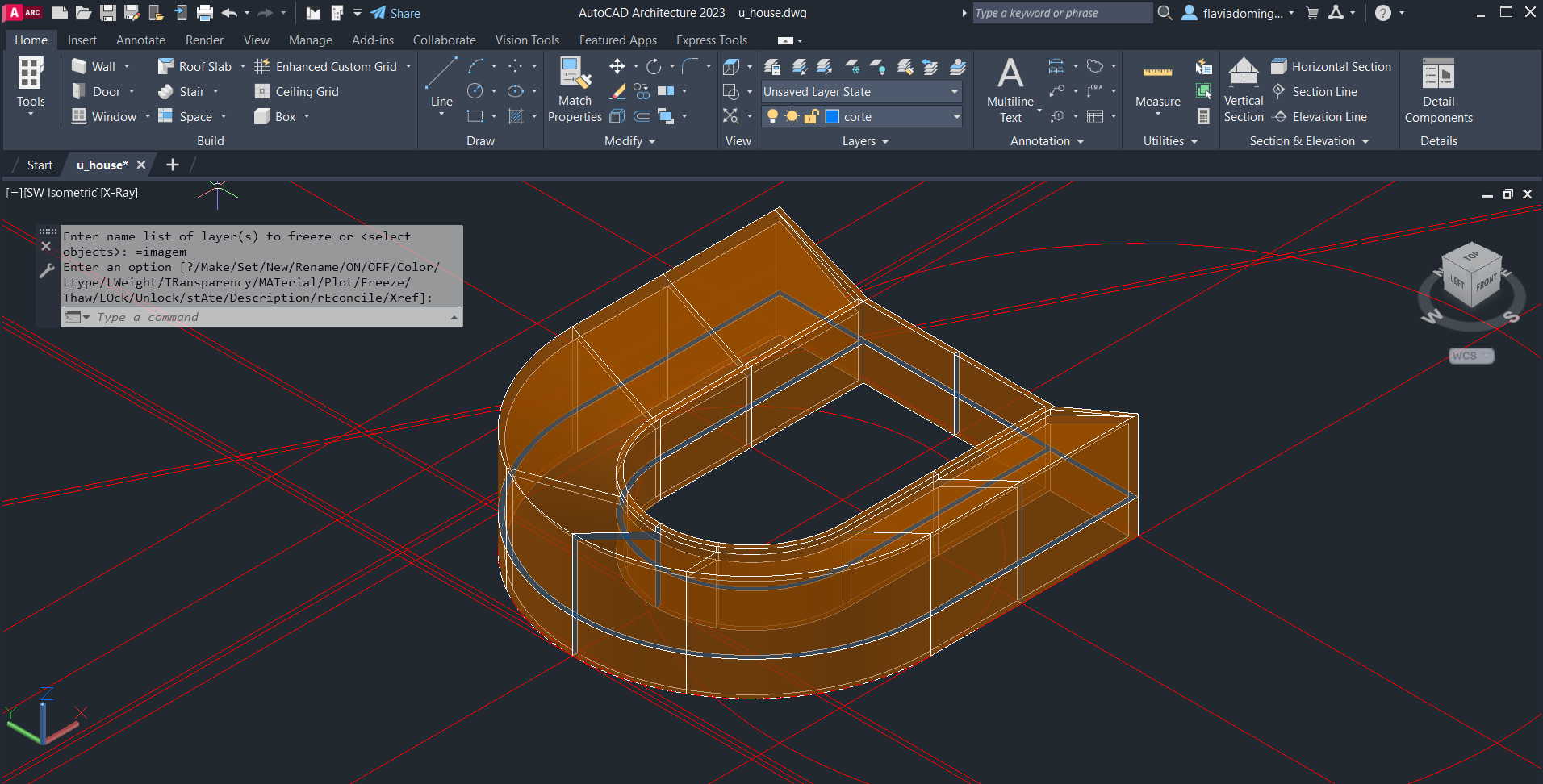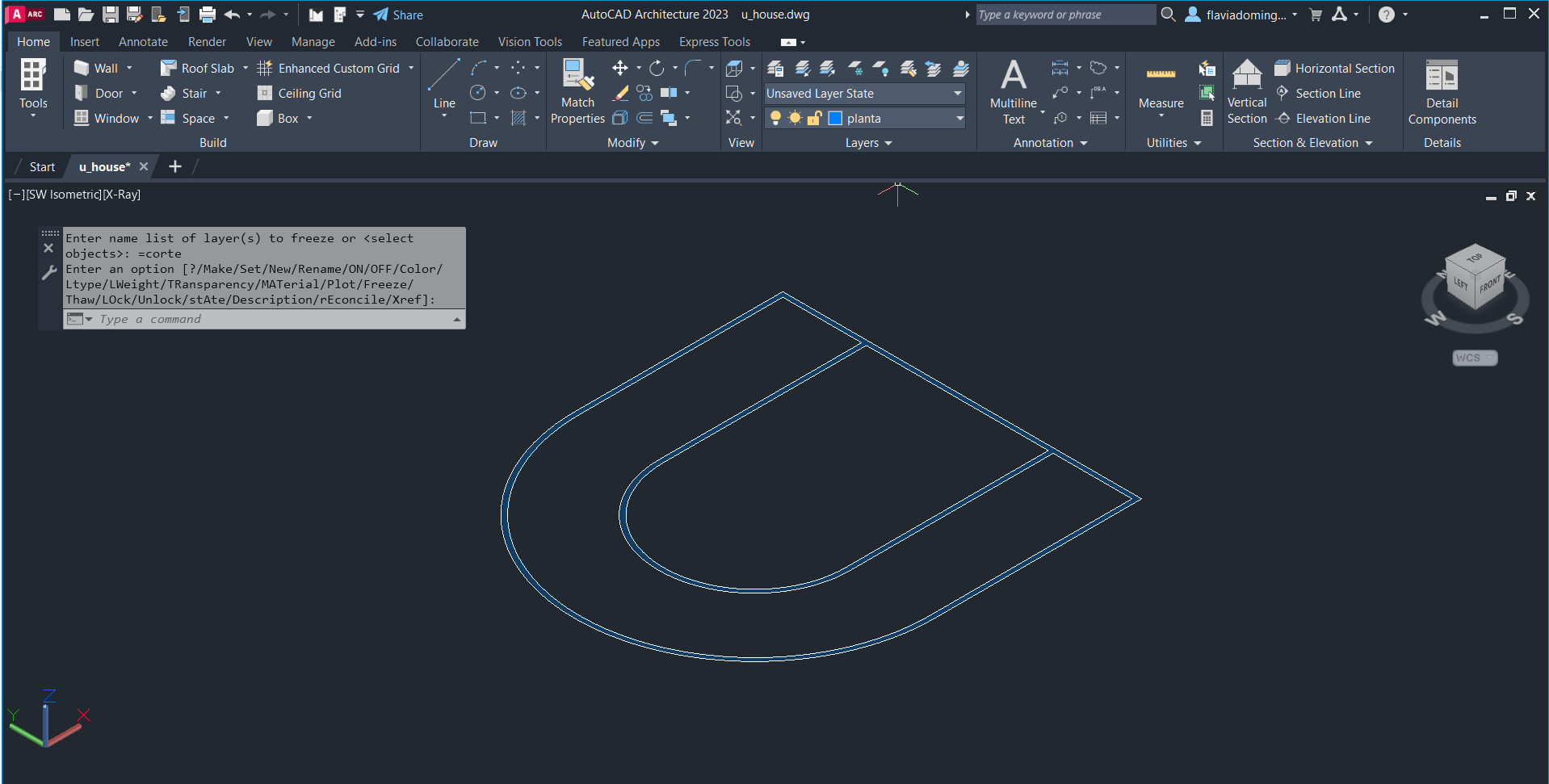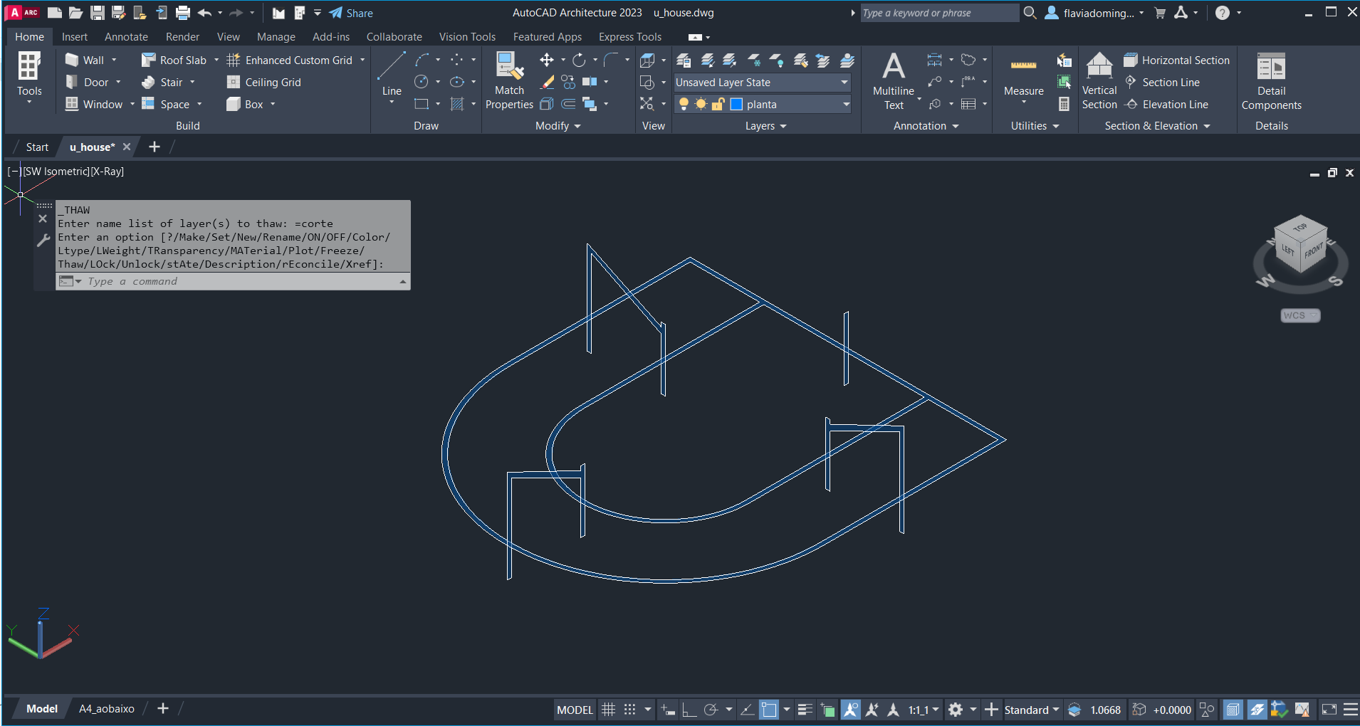 Criação de linhas auxiliares para fazer o contorno das paredes tanto na planta como no corte dados, para passar ao plano tridimensional e criar a forma da casa com auxílio de comandos como: ROTATE, EXTRUDE, PLINE. Posteriormente, fez-se uma nova planta a uma cota específica e cortes num plano escolhido - SECTION).