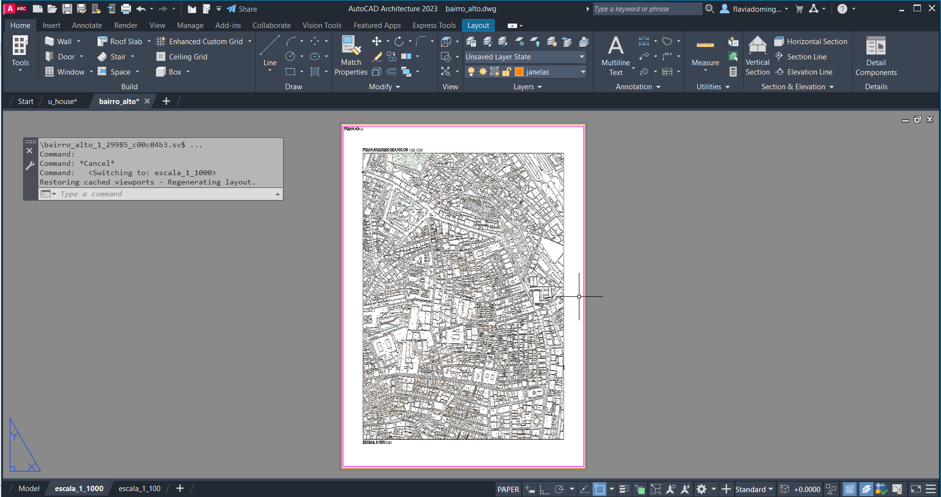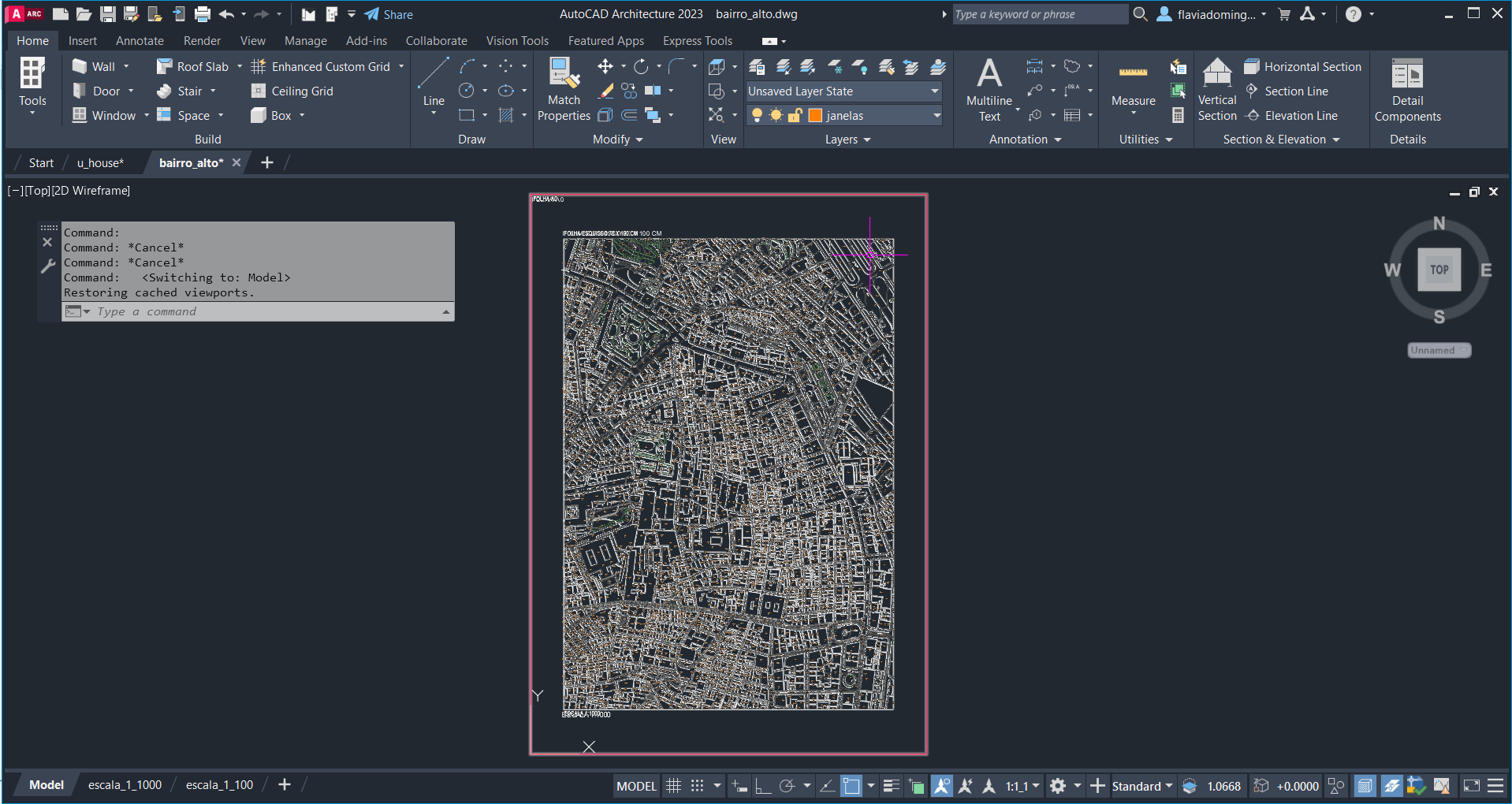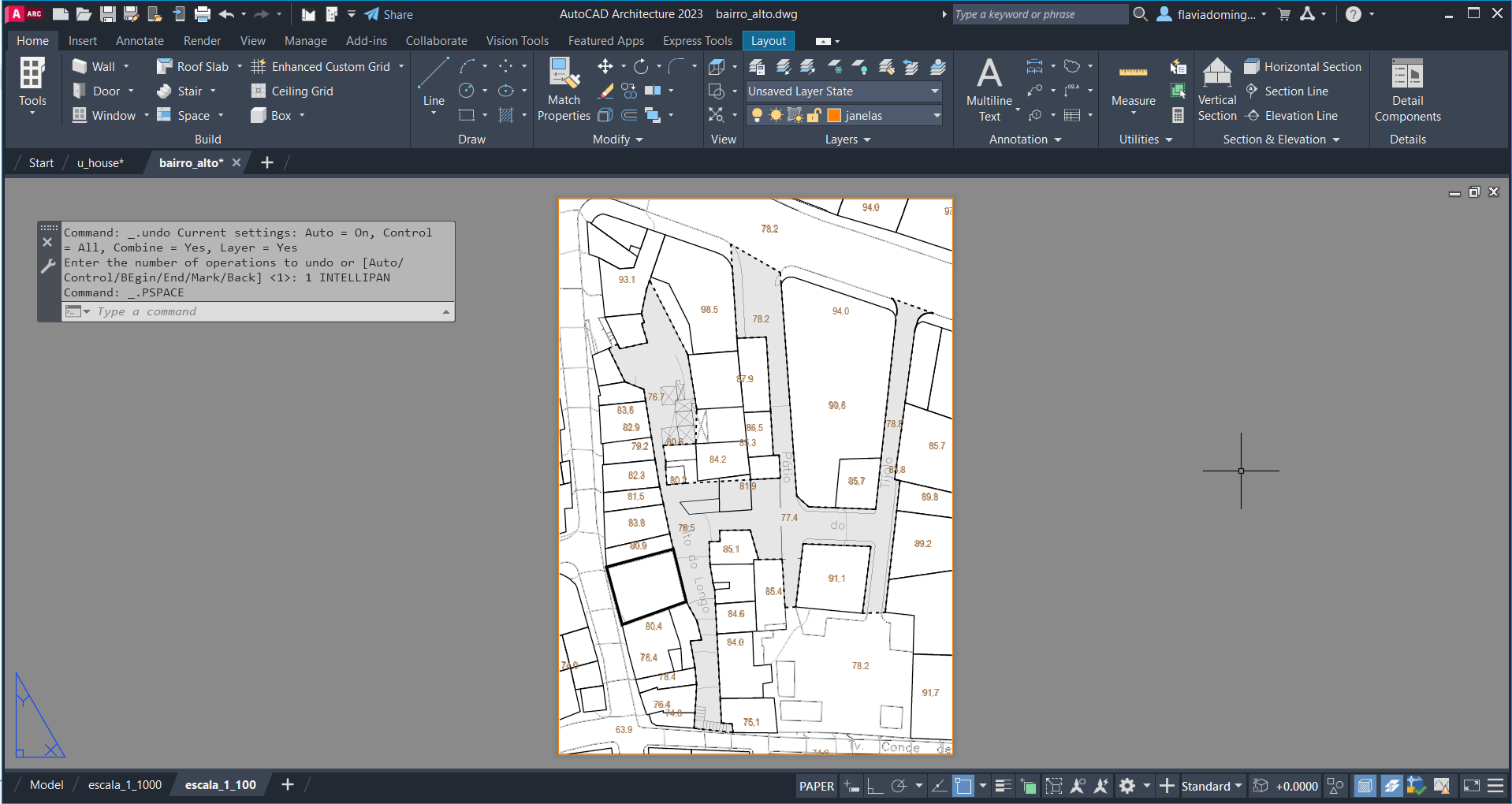 Criação de linhas auxiliares para fazer o contorno das paredes tanto na planta como no corte dados, para passar ao plano tridimensional e criar a forma da casa com auxílio de comandos como: ROTATE, EXTRUDE, PLINE. Posteriormente, fez-se uma nova planta a uma cota específica e cortes num plano escolhido - SECTION).