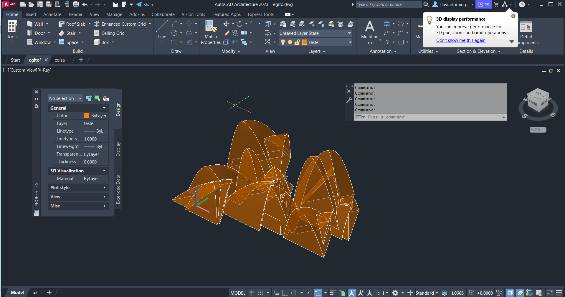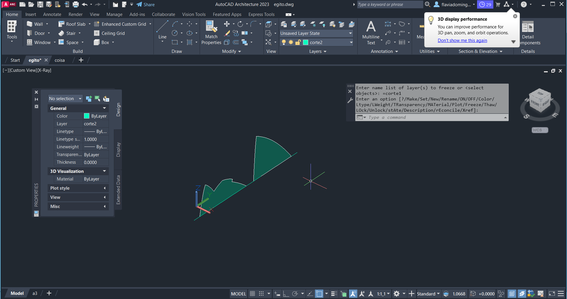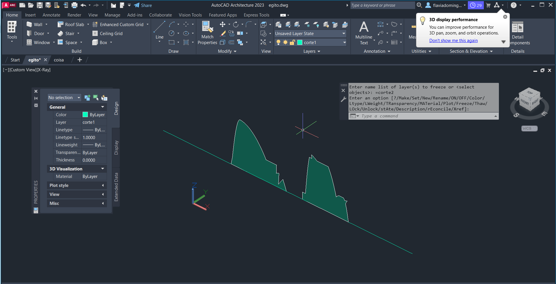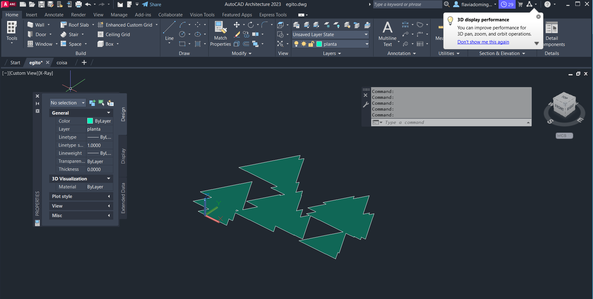 Uso do comando SECTION para criar a planta e os cortes, e uso do comando EXPLODE (ferramenta que divide um objeto composto em componentes individuais que o constituem).