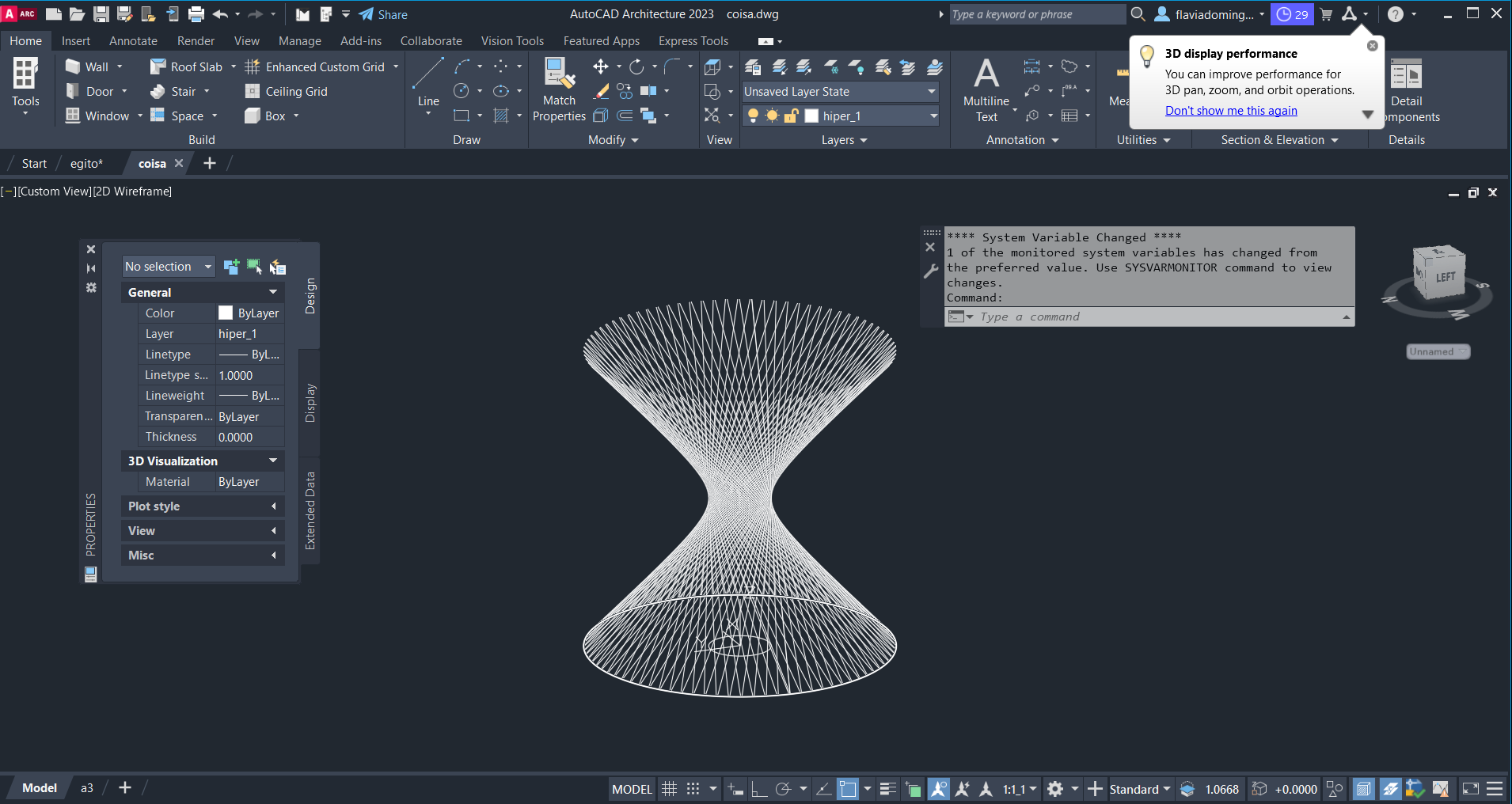 Representação de um hiperboloide, com auxílio de comandos como ARRAYCLASSIC e REVOLVE.