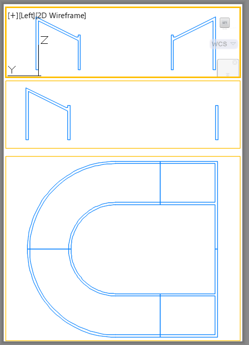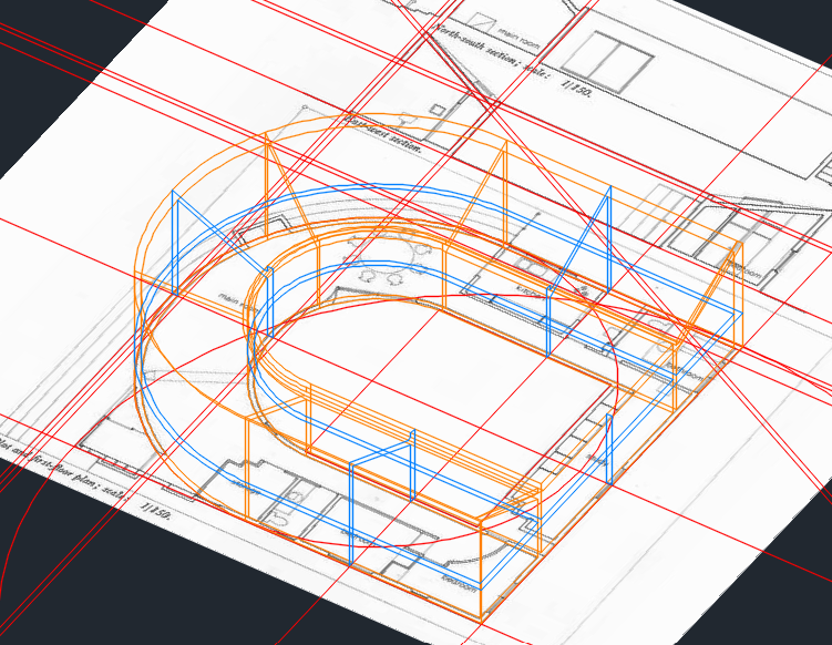 Meteu-se o desenho aproximadamente à escala real, e com a ajuda de linhas auxiliares, recriamos a planta base e o perfil, com ajuda do PLine.
