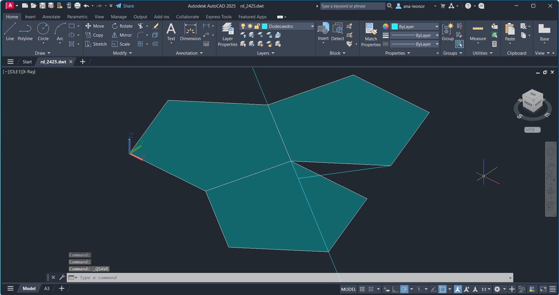 Uso de comandos auxiliares como XLINE e LINE, para a simular a planificação real do Dodecaedro.