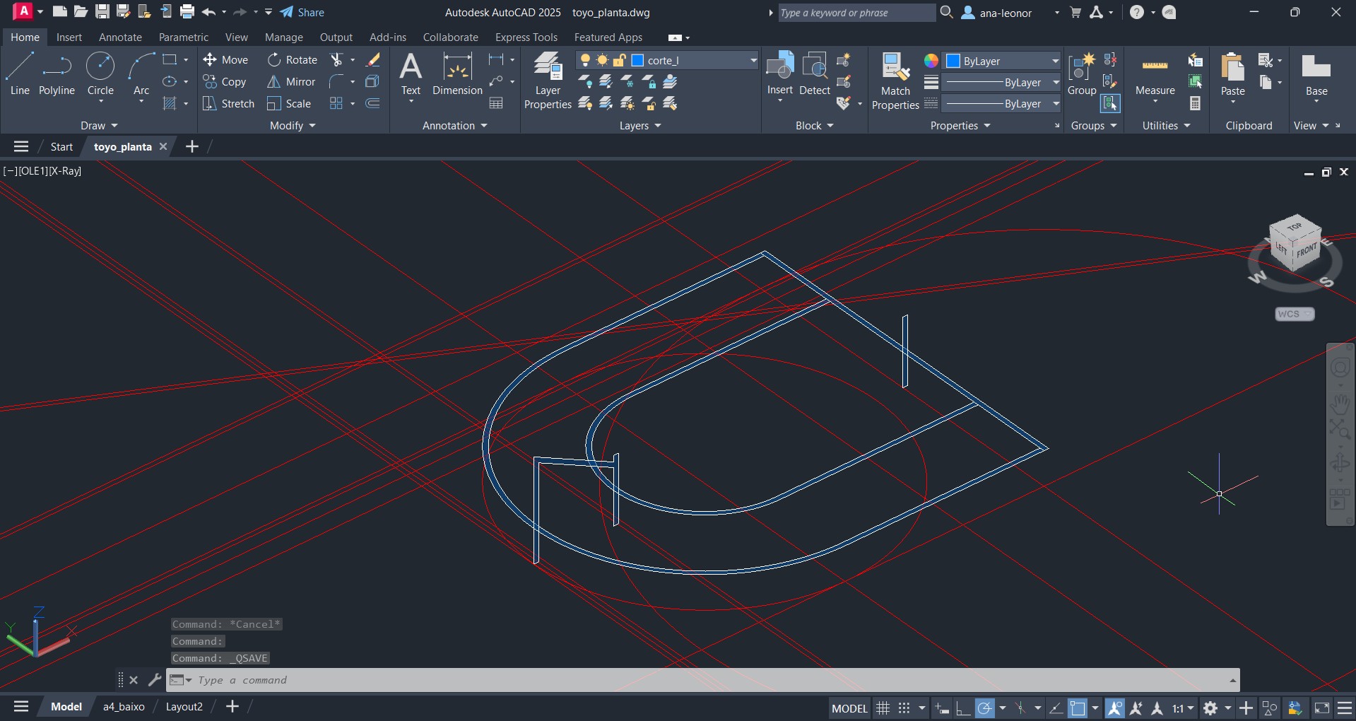 Inicio do estudo da planta, no plano tridimensional. Introdução de diversas linhas, através do comando X-LINE.