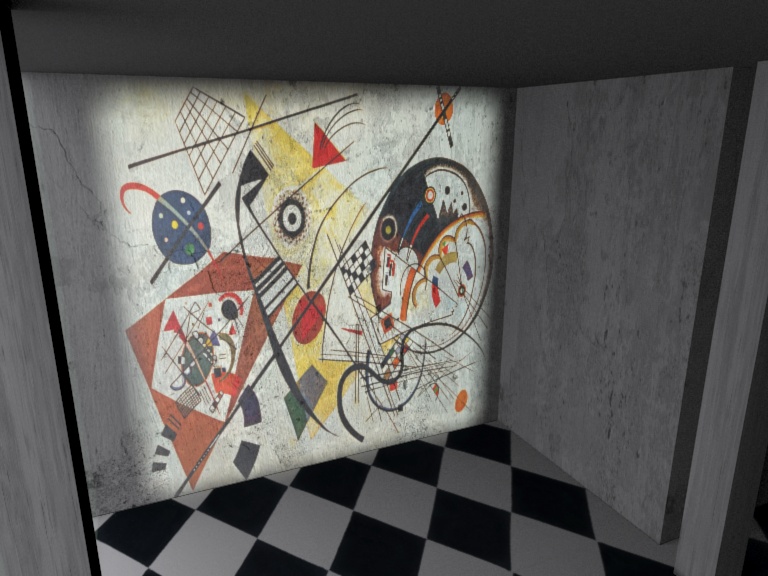 Para este efeito, modificou-se a posição da camara do observador e introduziu-se uma nova luz de projeção, portanto a pintura de Kandinsky.