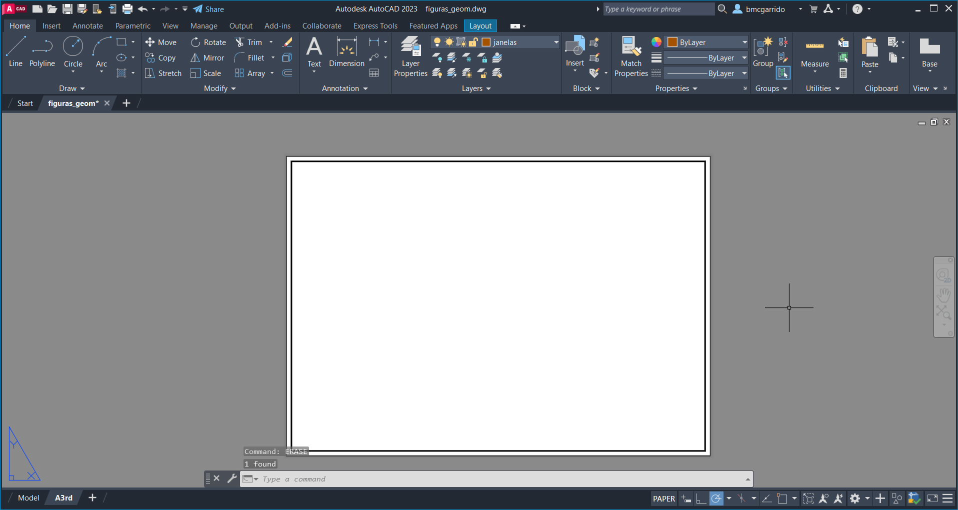 Exploração de novos comandos para criar uma esquadria numa folha (xline, offset, trim).