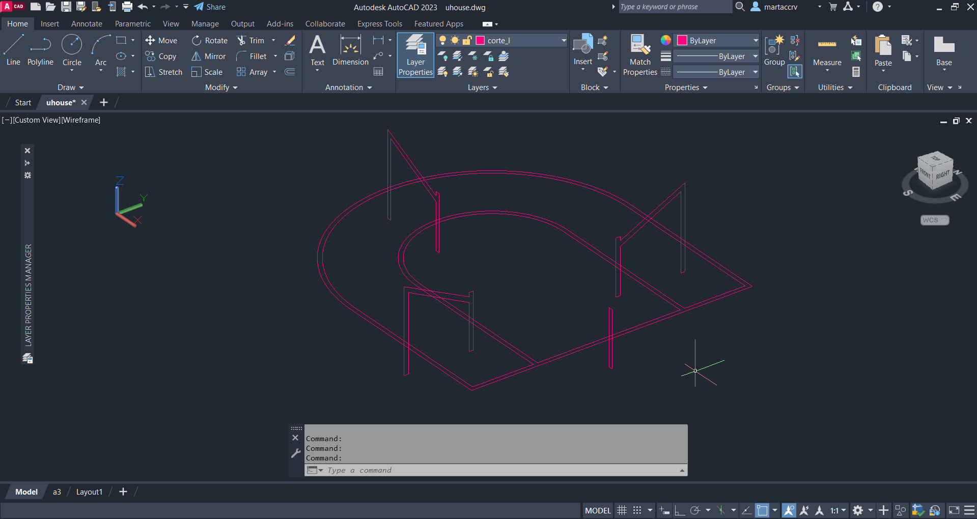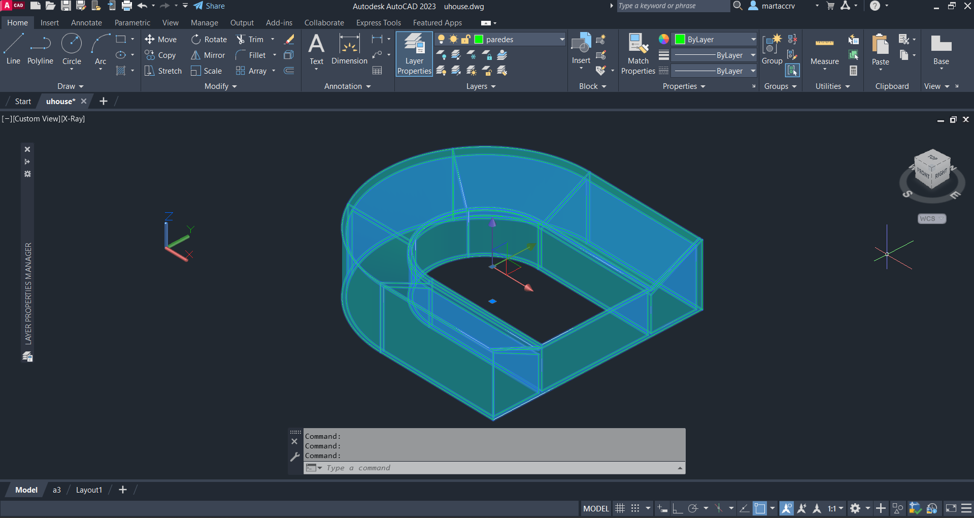 Aprendemos novos comandos tais como o "extrude" para fazer uma parede continua e tornar tudo em apenas uma peca. Para os cortes usando o comando "section".