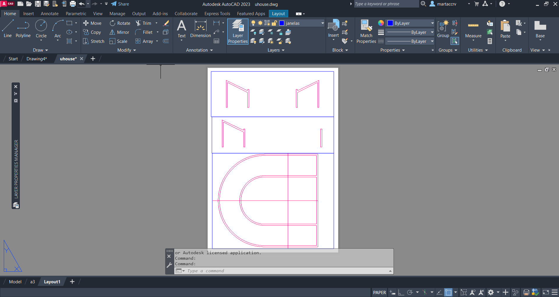 Na primeira aula da semana, concluimos o ficheiro da uhouse colocando a planta e os cortes no layout da folha a4 que tinhamos feito.