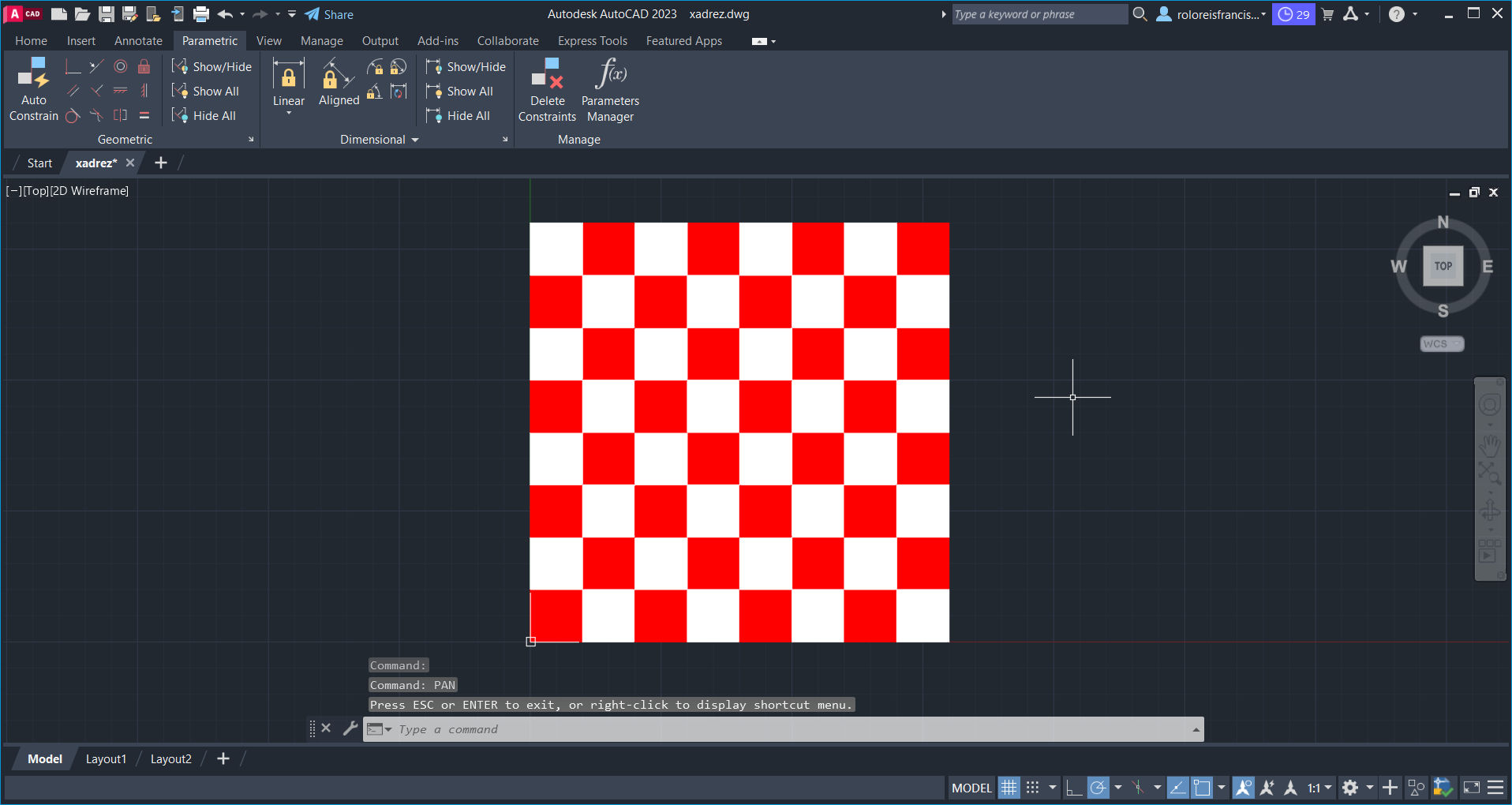 Primeira experiência com o software através da criação de um tabuleiro de xadrez usando o autocad e com o mesmo método através do Notedpad++.