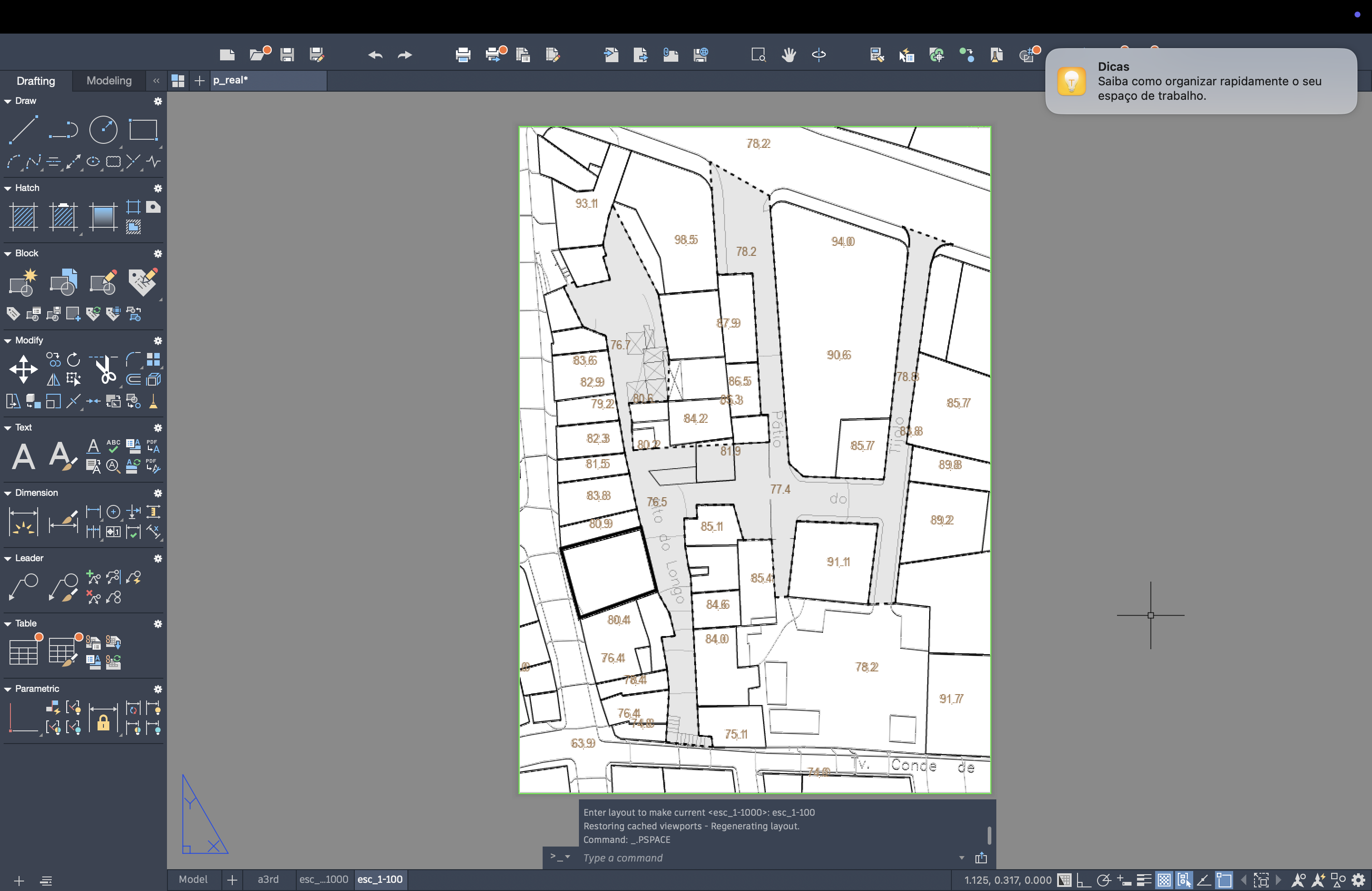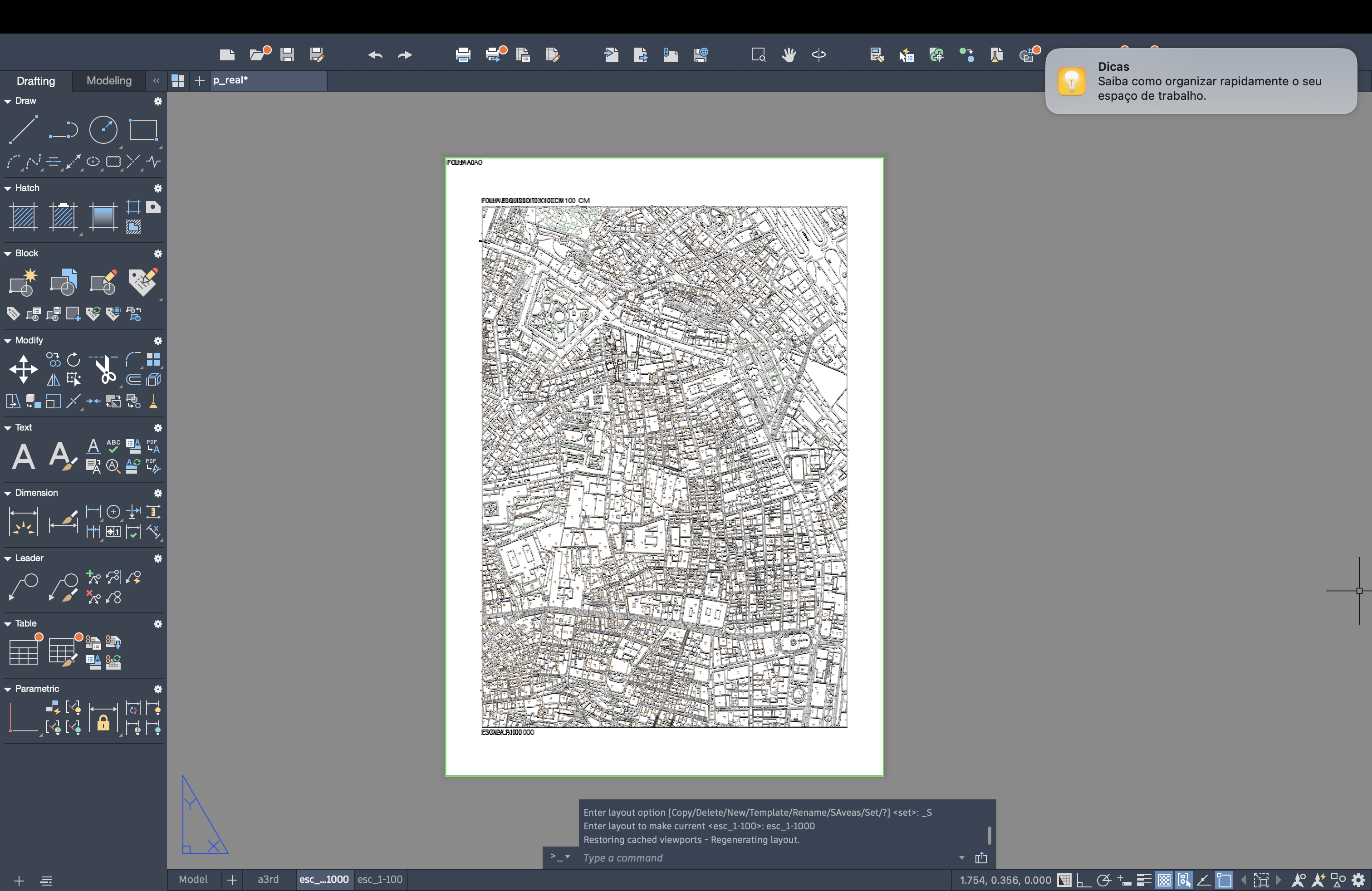 Criação de dois layouts A0, onde se escalou corretamente a planta para as escalas 1/100 e 1/1000.