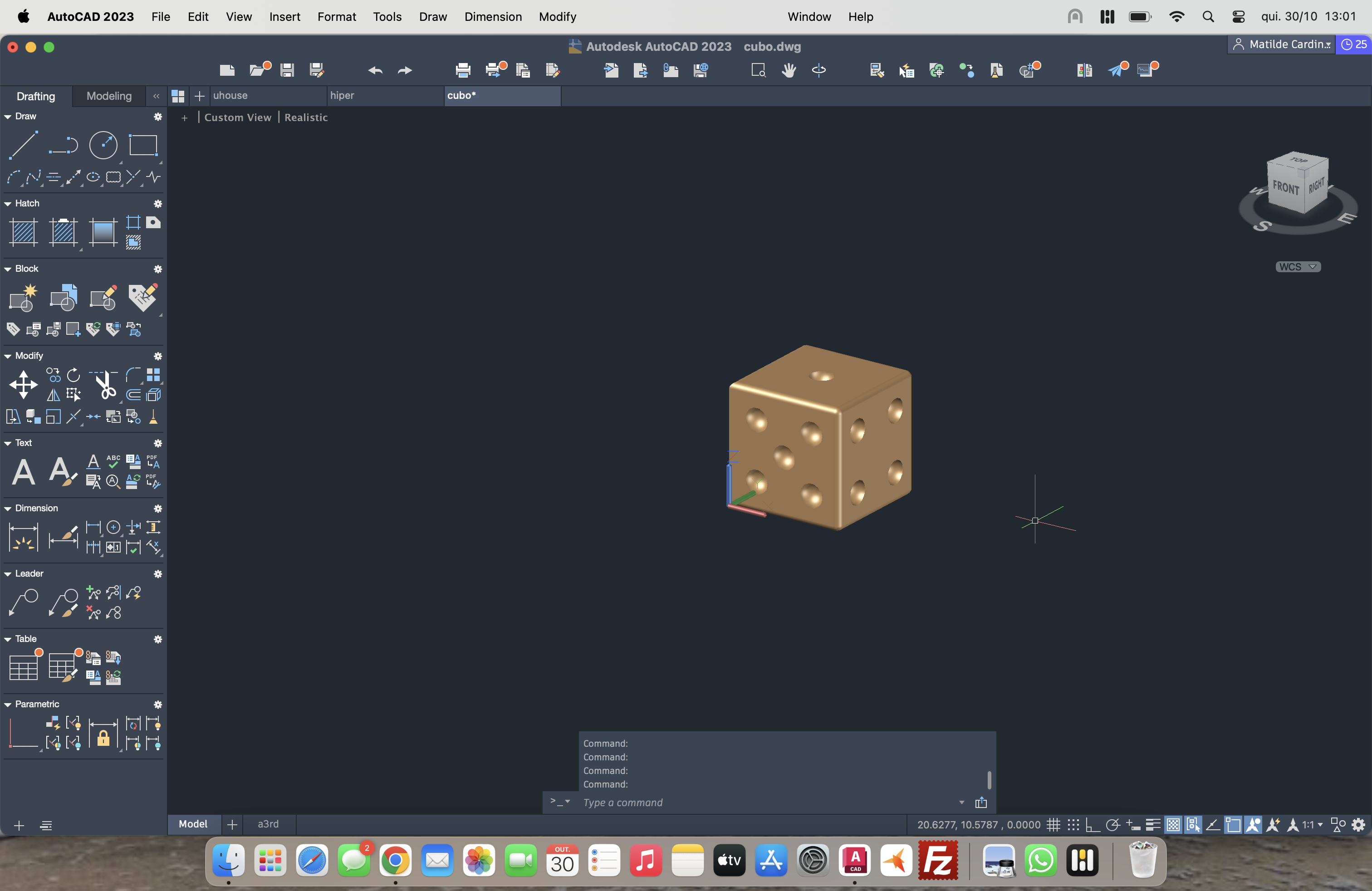 Construção de um dado através da realização de um cubo e seis esferas. Utilização de novos comandos no Autocad (subtract)