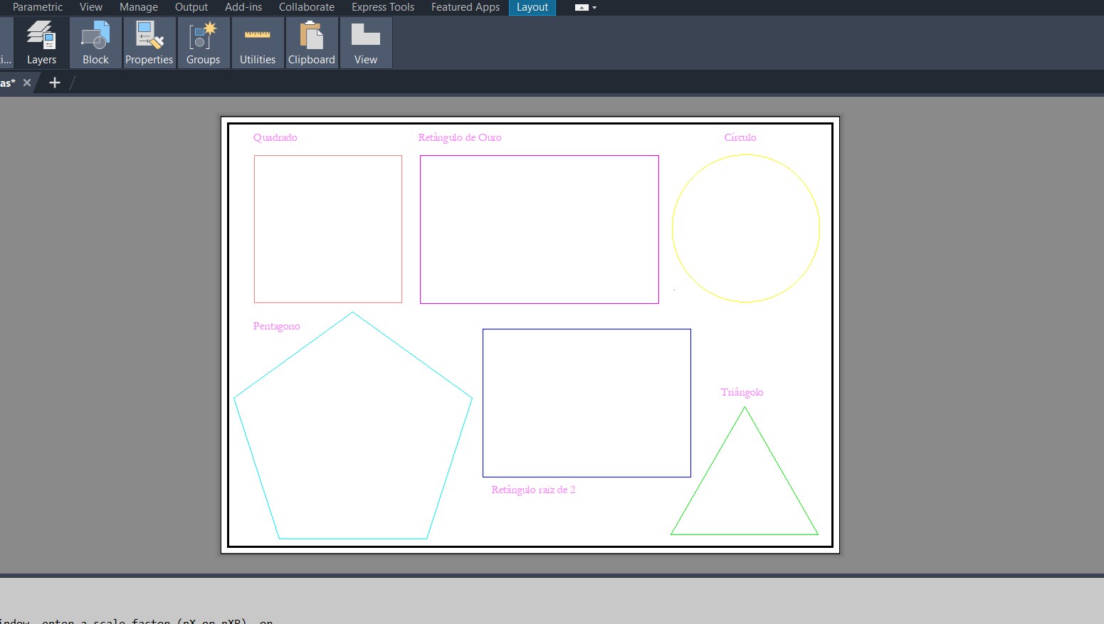 Continuação e conclusão do exercício no AutoCad: Criação de 6 polígonos dentro de diferentes janelas com respetiva legenda e medida.