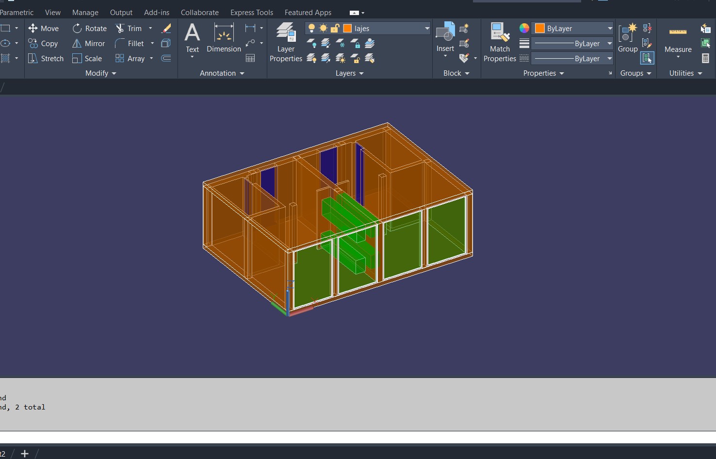 Mudança dos elementos para as suas layers e cores correspondentes. Depois, união das paredes e pilares, através do comando: UNION.