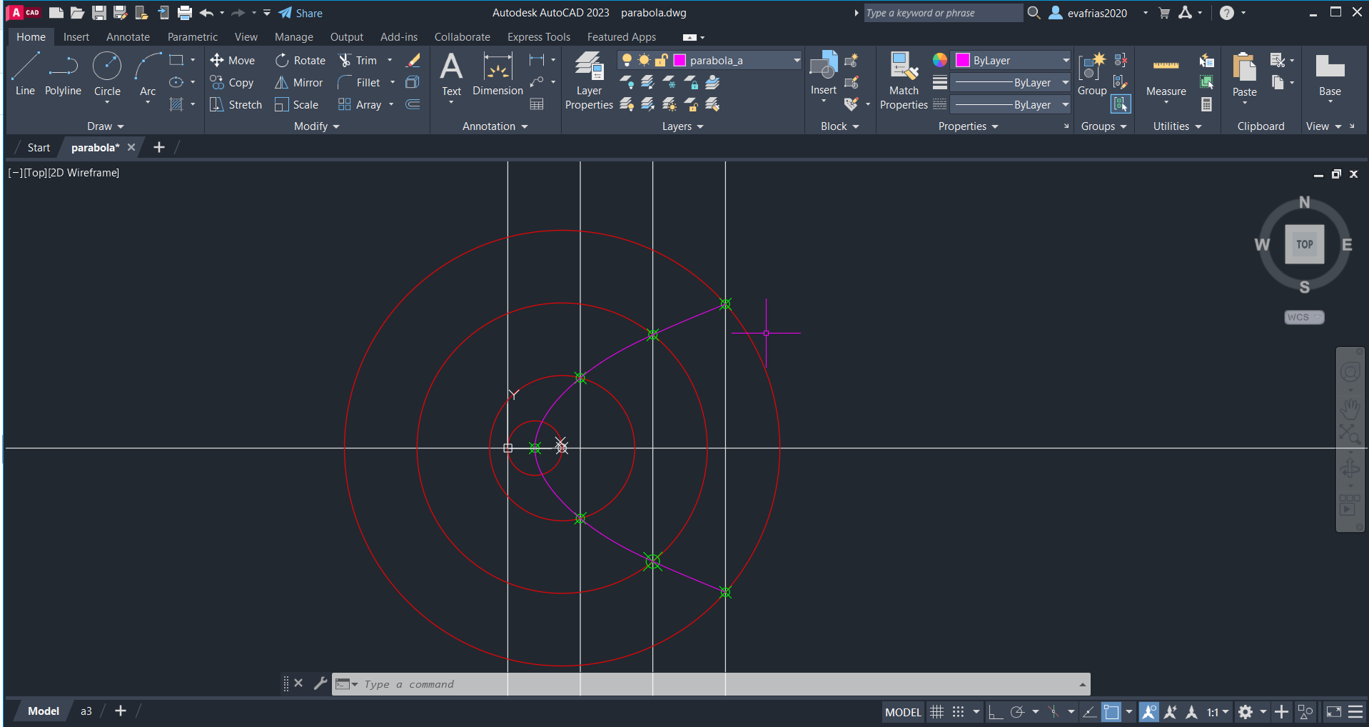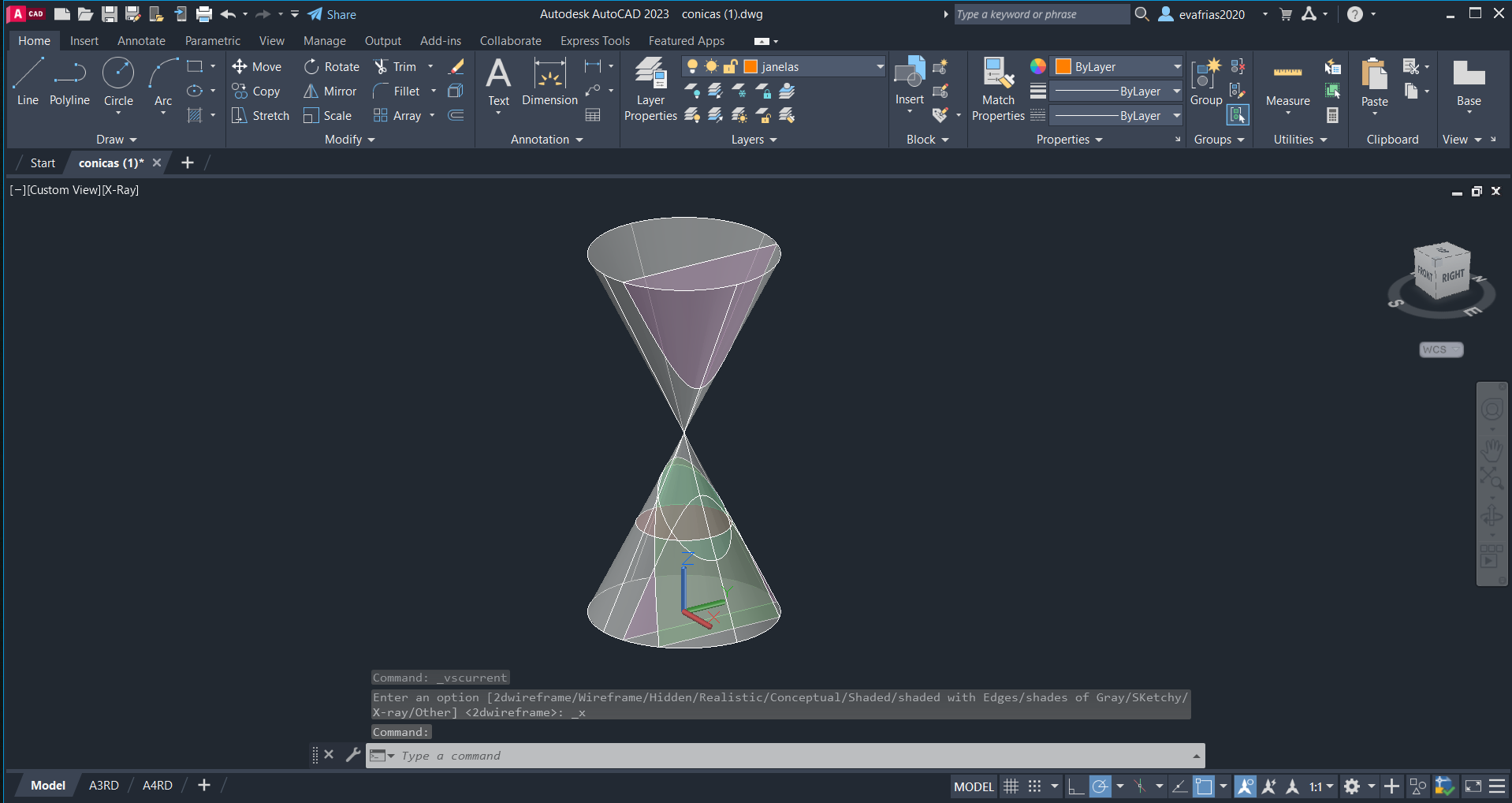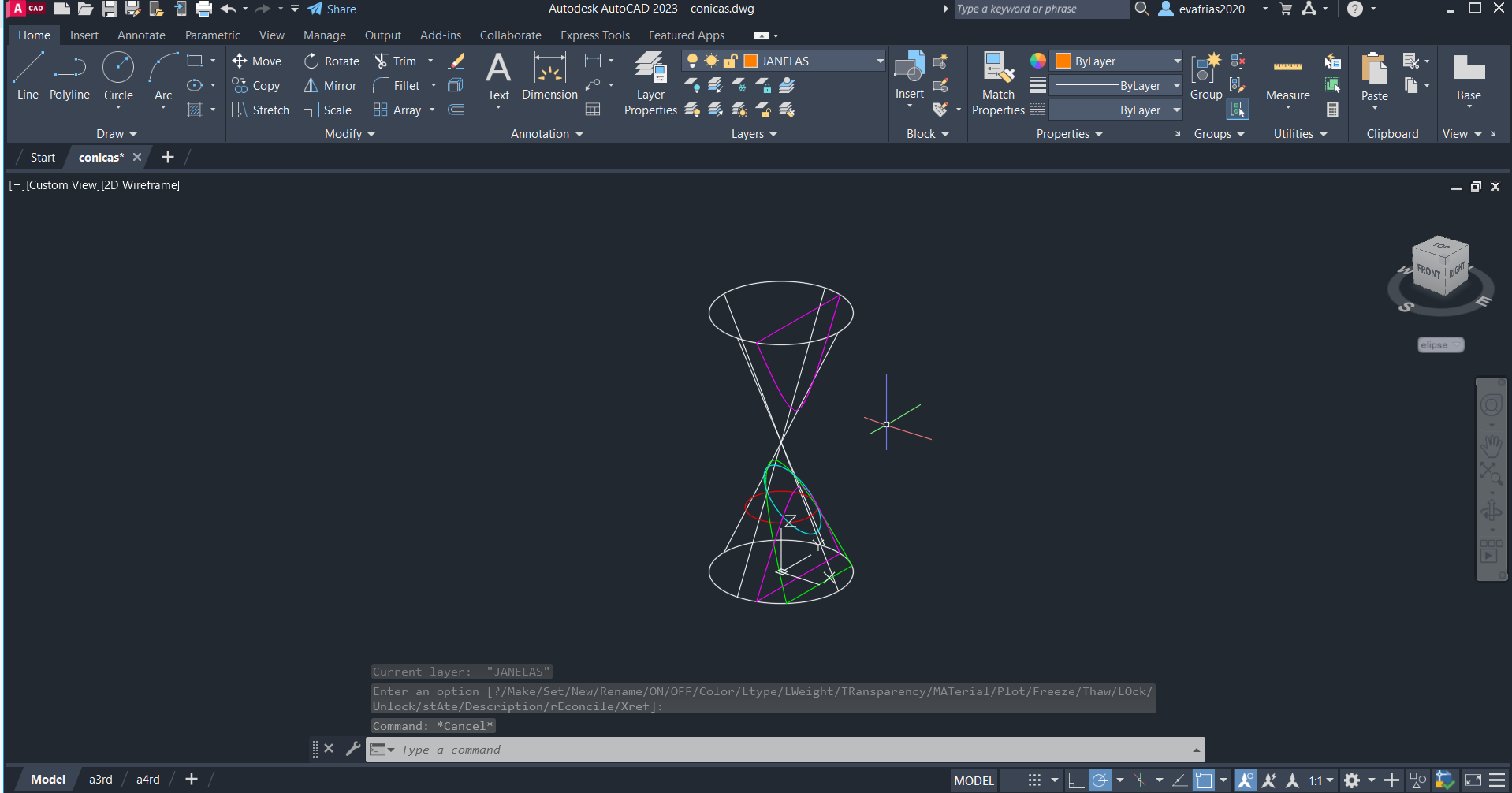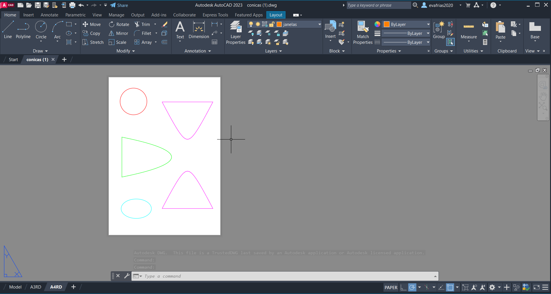 Apresentação de cada elemento (círculo, elipse, hipérbole e parábola) na folha A4, à escala 1/20.