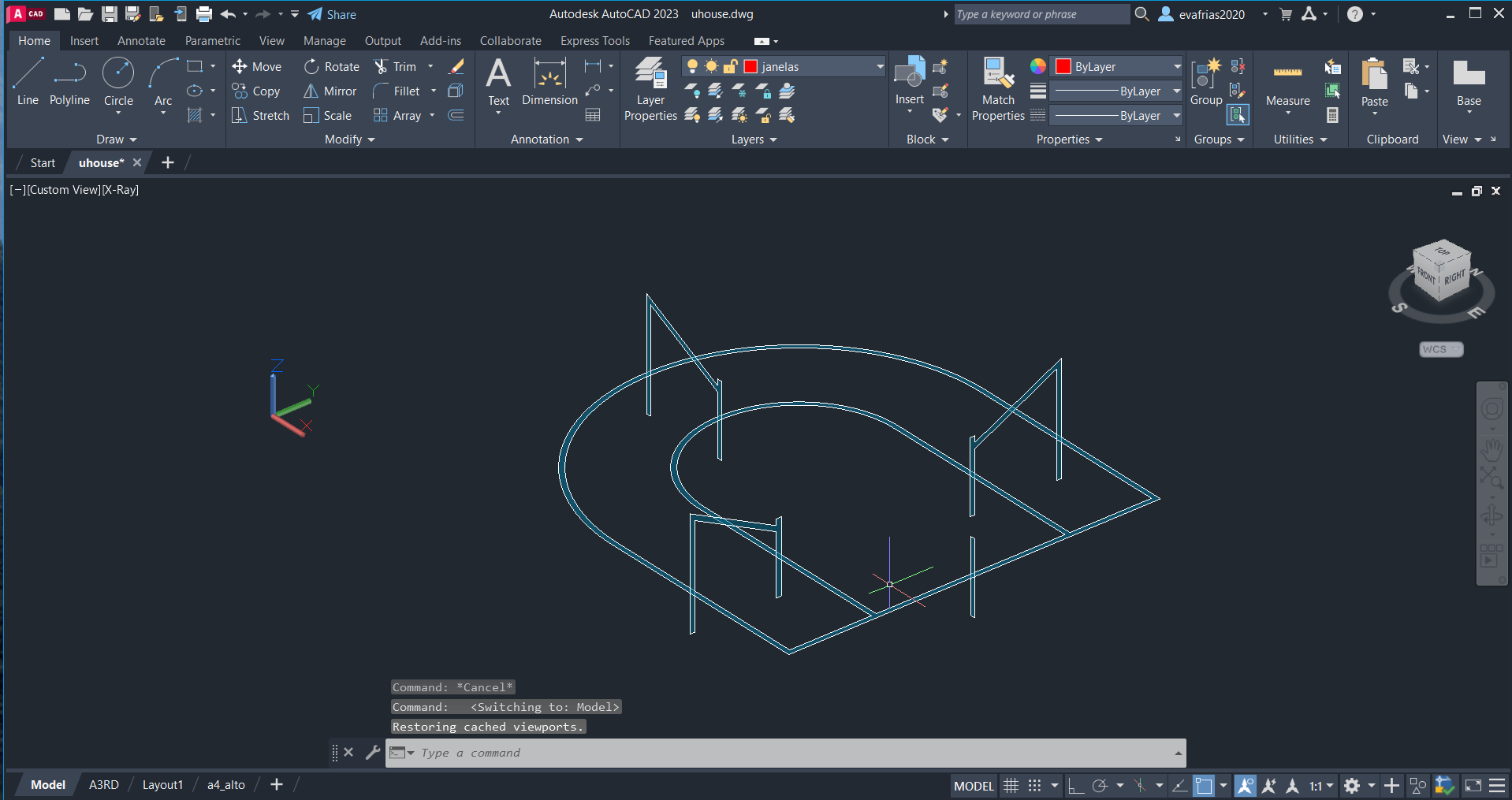 Criação de um layout A4, onde se inseriu a planta e respetivos perfis escalados. Atribuição de cotas à planta com o comando DIM.