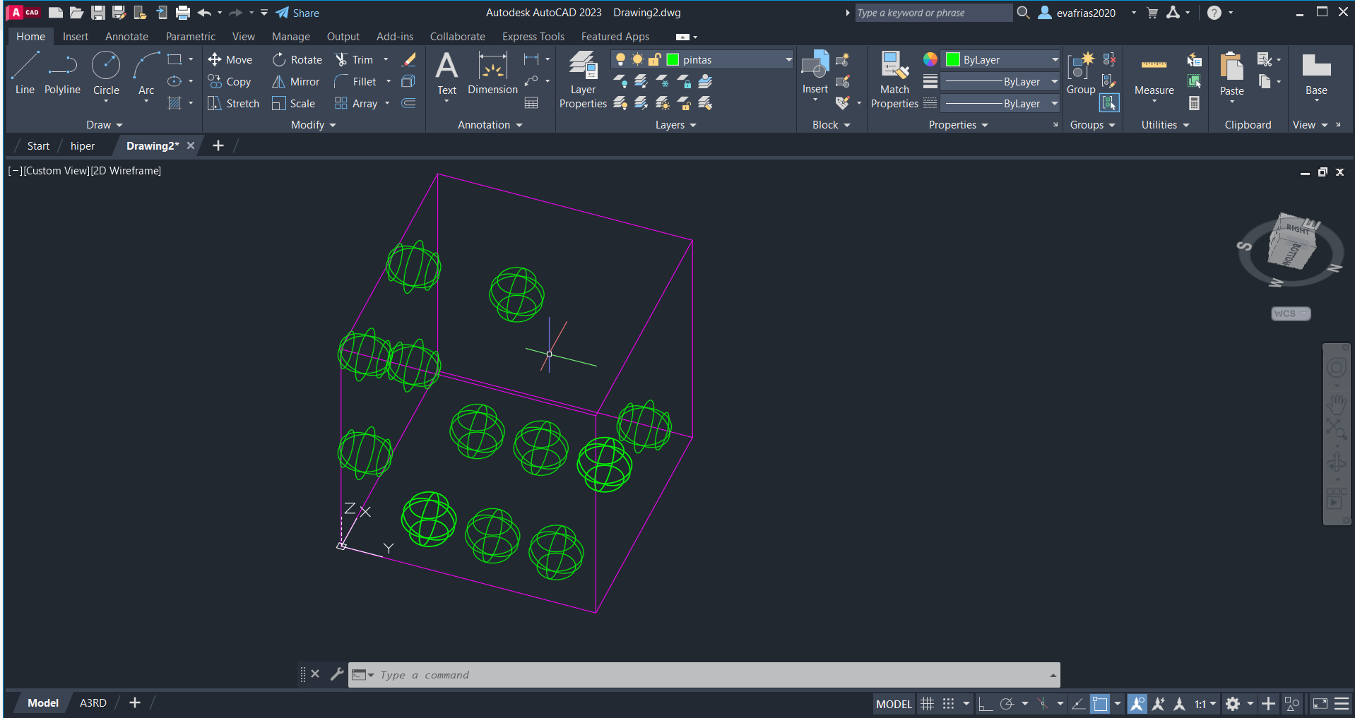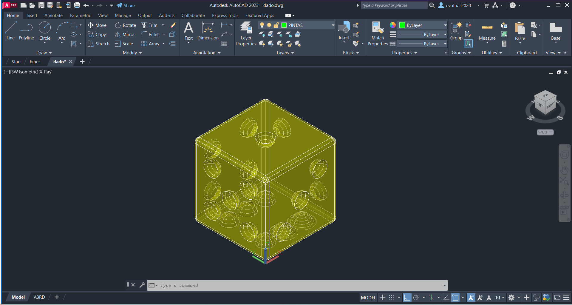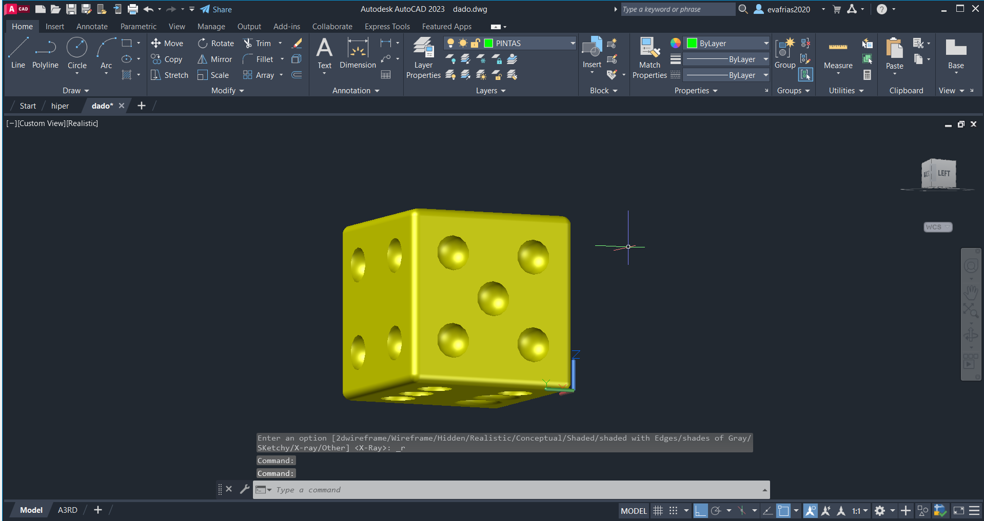 Construção de um dado através da realização de um cubo e seis esferas. Utilização de novos comandos no Autocad (subtract)