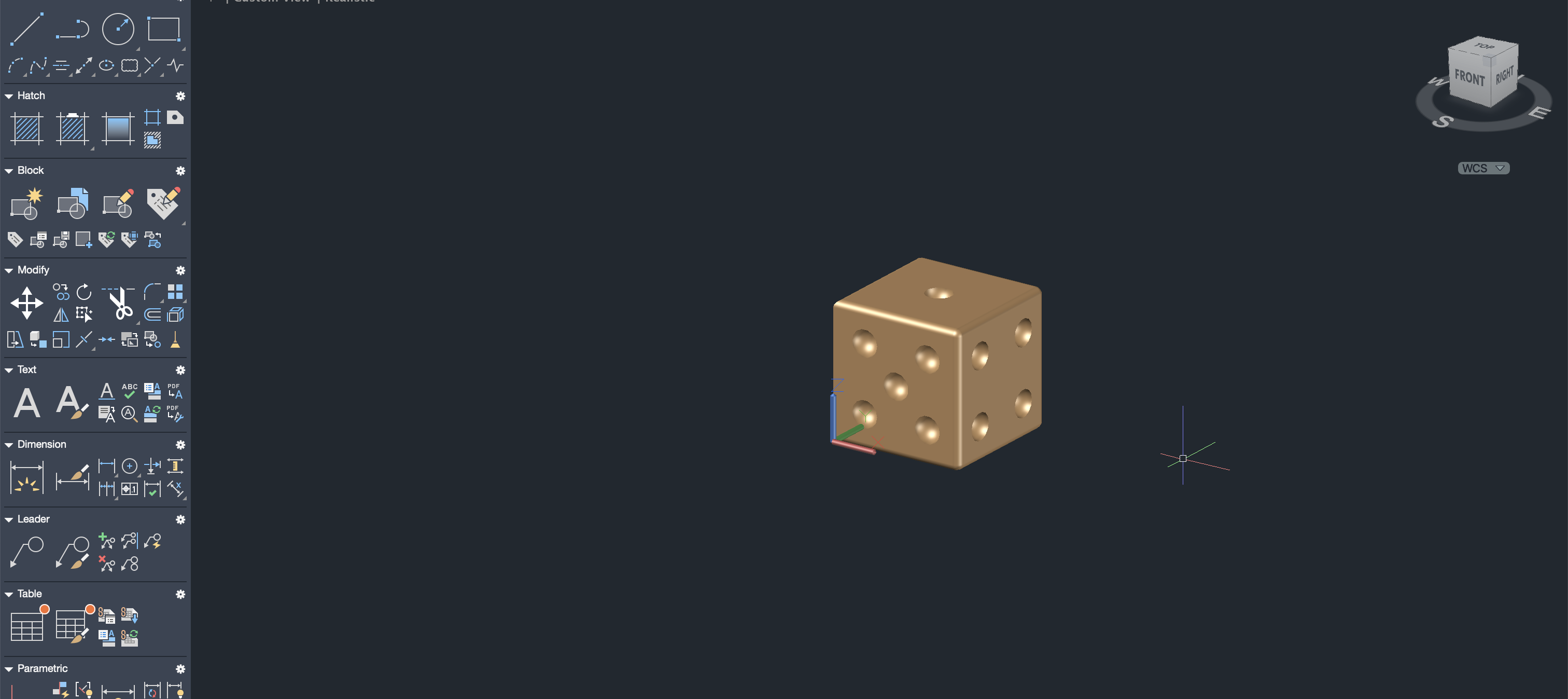 Construção de um dado através da realização de um cubo e seis esferas. Utilização de novos comandos no Autocad (subtract)