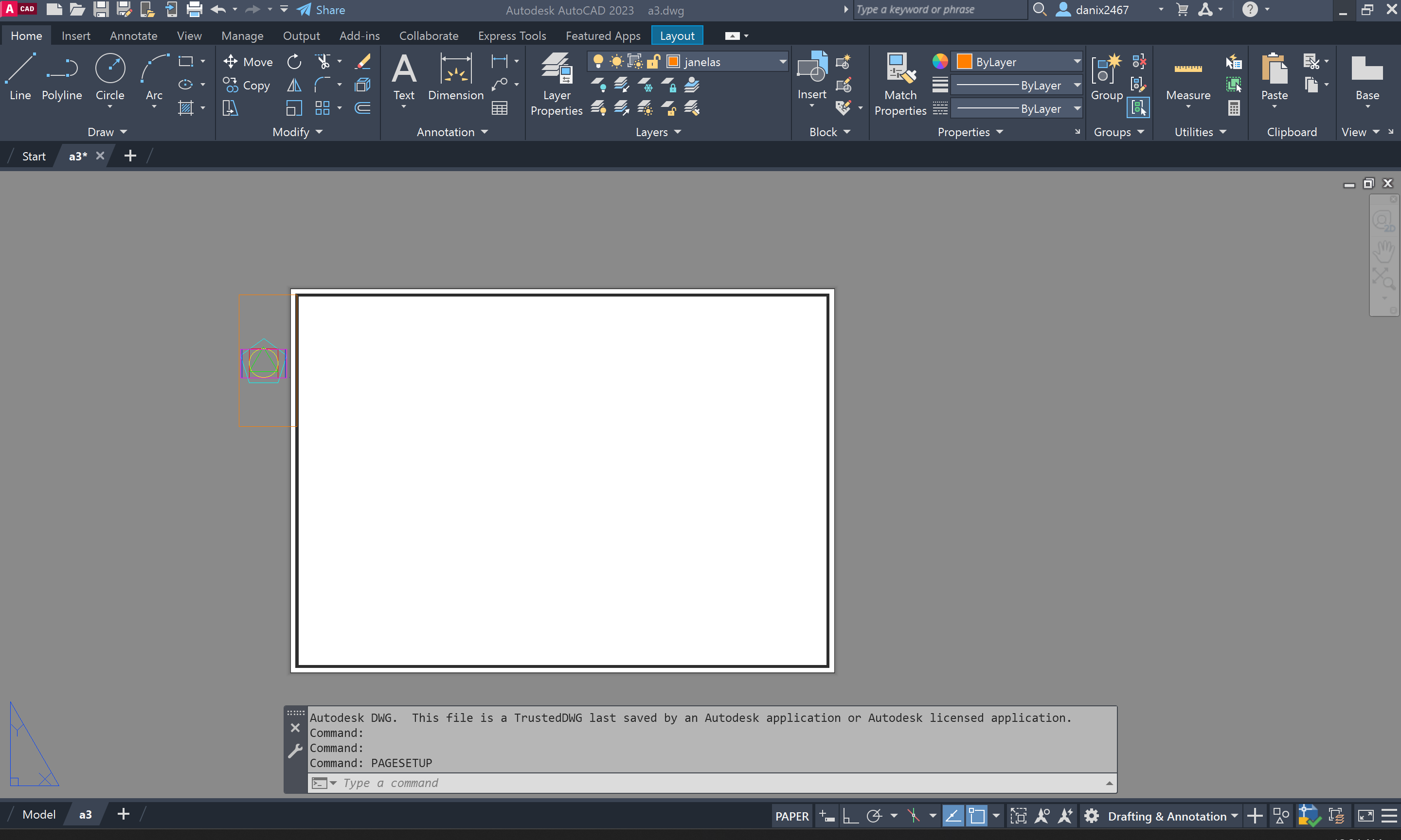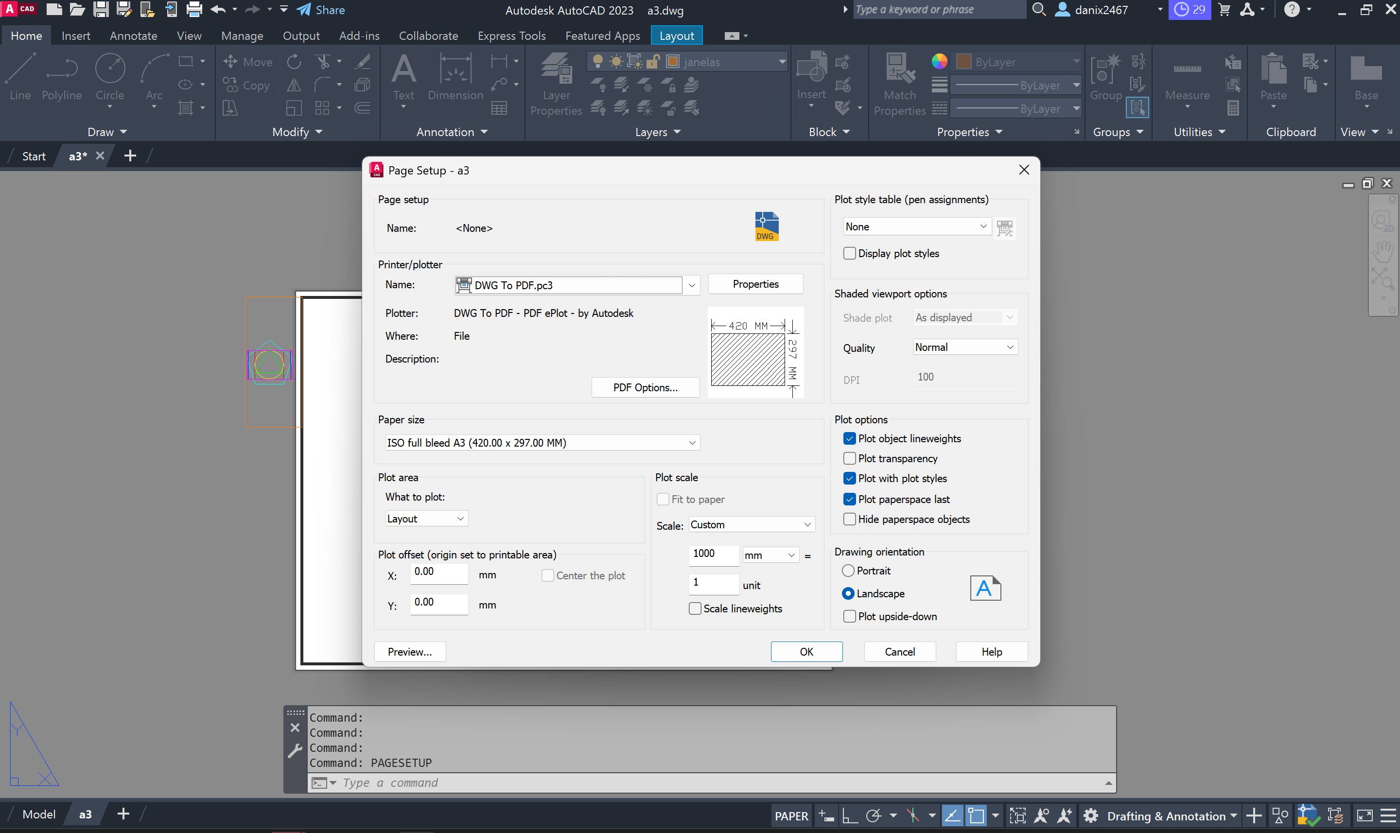 Posteriormente, a finalização da figura geométrica procedemos a estudar a função Layout1. Esta funç&atlde;o compara-se a uma folha de papel, cujo acabamos por atribuir características da mesma como o tamanho da folha A3 e escala do layout pelo command PAGESETUP. Em seguida, após ser modificada, utilizamos o command TRIM para eliminar todas as linhas definidas através das Properties.
