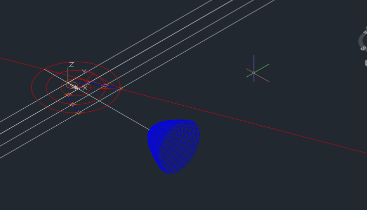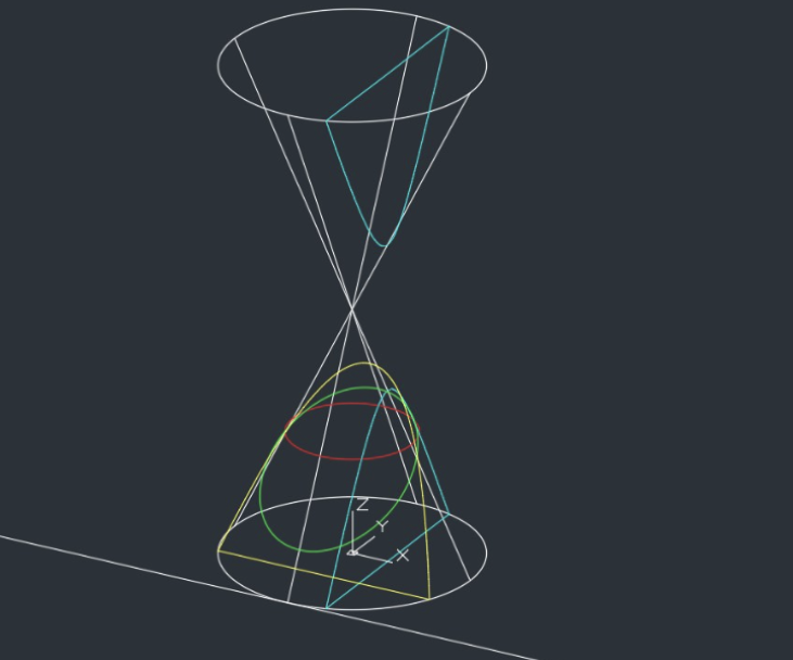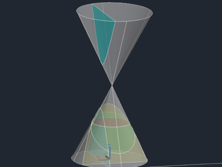 Prosseguiu-se com a construção de dois cones, utilizando o comando CONE, alternando as vistas com VPOINT e variando entre os estilos visuais 2D Wireframe e Shaded with Edges. O comando SECTION foi aplicado para efetuar cortes nos cones e obter as diferentes curvas resultantes.