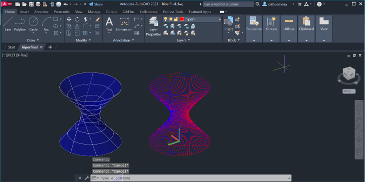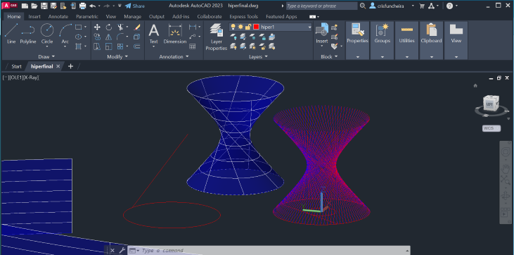 Nova representação de hipérboloides, através dos comandos ARRAYCLASSIC e REVOLVE (gera um solido 3D ou superficie 3D ao rodar um perfil 2D, em torno de um eixo definido).