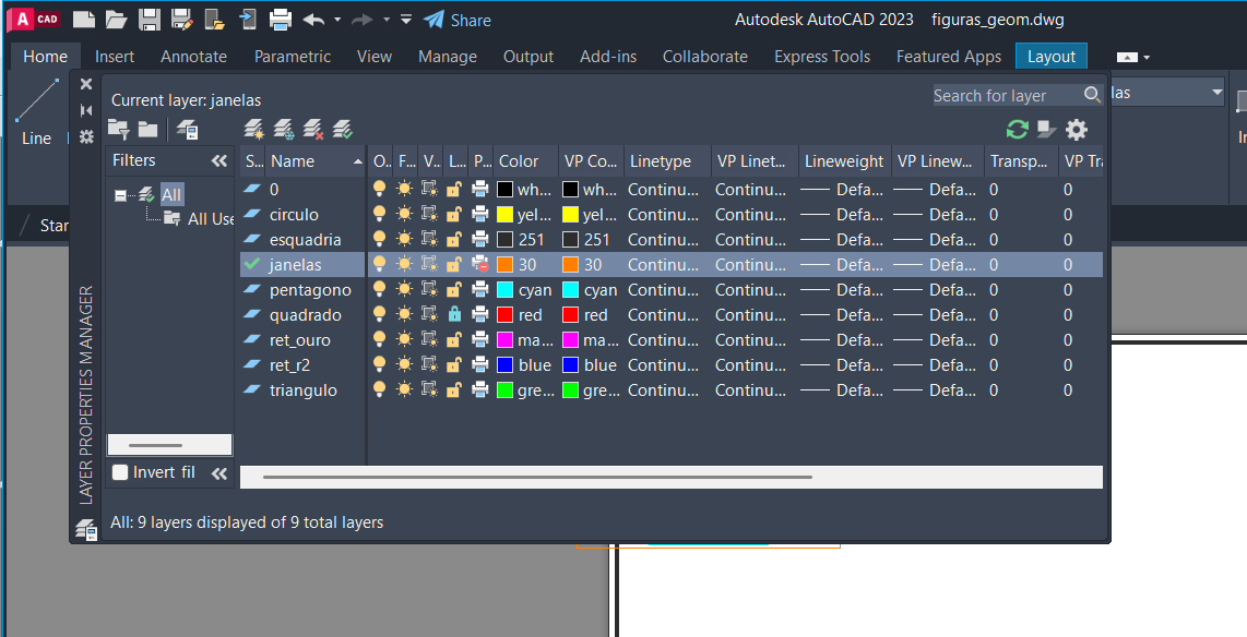 Conclusão do trabalho das figuras geométricas no Autocad, criação de uma folha a3 e de uma nova layer no mesmo programa.